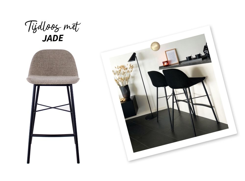 Barkruk JadeKrachtig en robuust, maar met een stijlvolle knipoog naar design. Door de comfortabele rugleuning en zachte zitting is hij uitermate geschikt voor aan de ontbijt/borrel bar. De zitting is bekleed met een grove katoenen textuur stof en in combinatie met het zwart stalen frame geeft hij jouw interieur de uitstraling die je zoekt. |
