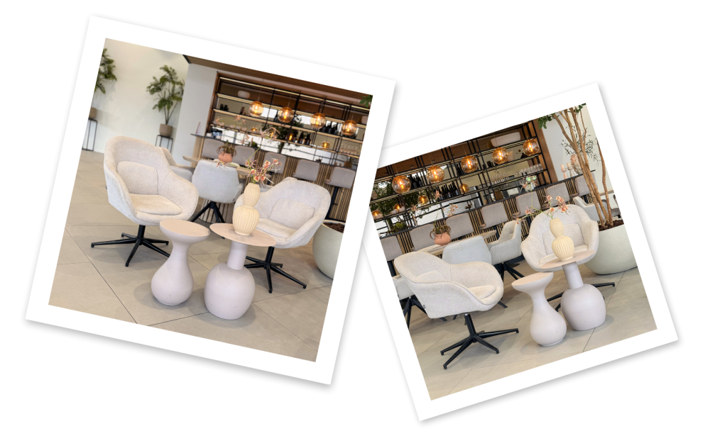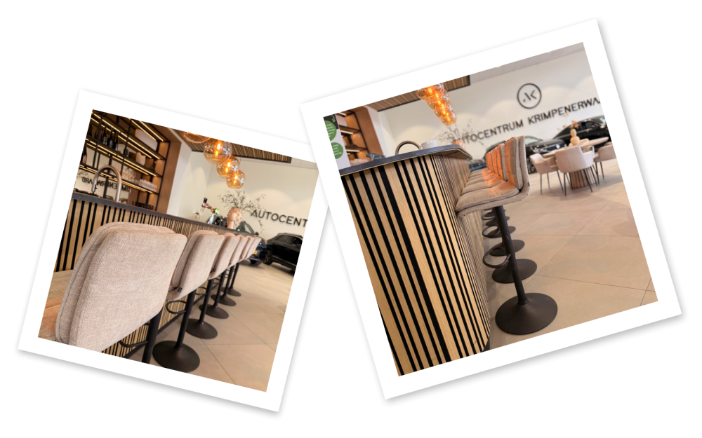 Wat mij ook direct opviel, was de prachtige bar achterin de ruimte. Een luxe houten bar met strakke barkrukken, en ja, natuurlijk van ons! Het ging om de Roan barkrukken. Dankzij de comfortabele zitting met extra zit- en rugkussen en het 360-graden draaibare, in hoogte verstelbare frame zijn ze echt de perfecte match voor deze stijlvolle bar. |