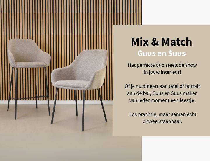 Mix eetkamerstoel Guus met barkruk Suus. Beide bekleed met dezelfde populaire gemêleerde texture stof en verkrijgbaar in 5 kleuren. Beide met een minimalistische uitstraling waardoor ze in ieder interieur passen. Laat Suus en Guus samenwerken om jouw interieur tijdloze elegantie te geven.