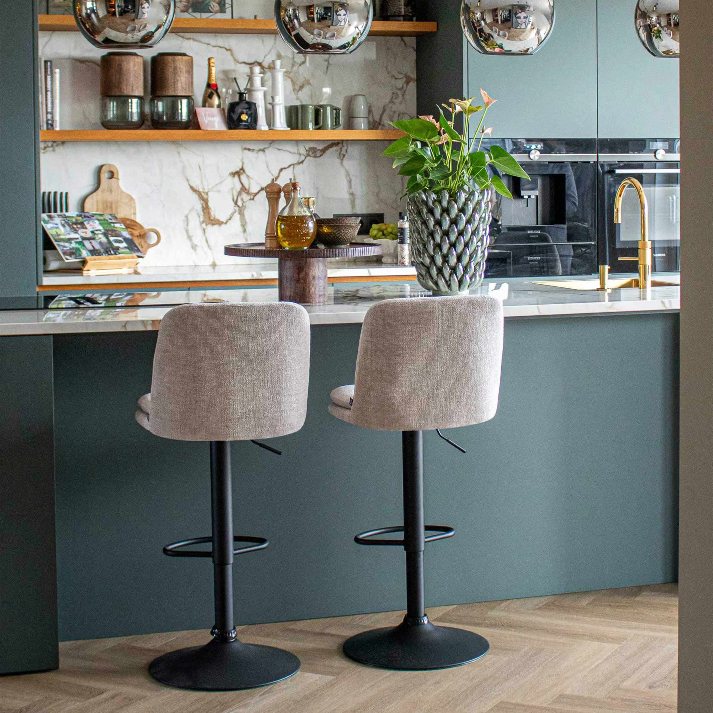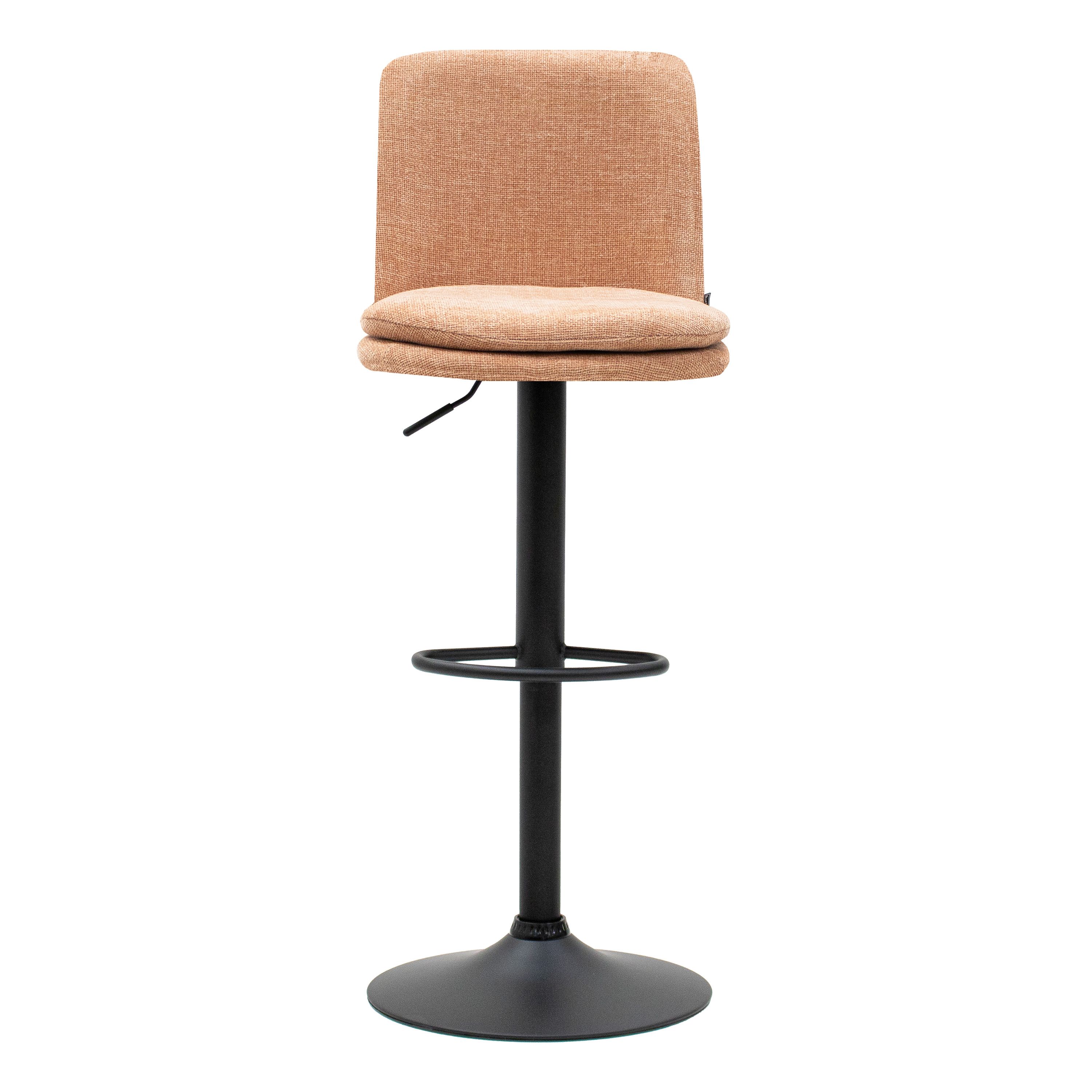 Meet barkruk Liam! Deze draaibare barkruk is van alle markten thuis! De comfortabele zitting rust op een tof 360-graden draaibaar frame dat in hoogte verstelbaar is, dit zorgt ervoor dat de kruk af te stellen is op een ideale hoogte. De zitting is gestoffeerd in een fijne texture stof met een zachte touch, dit geeft de kruk een chique en uitnodigende uitstraling. Liam is verkrijgbaar in diverse kleuren.