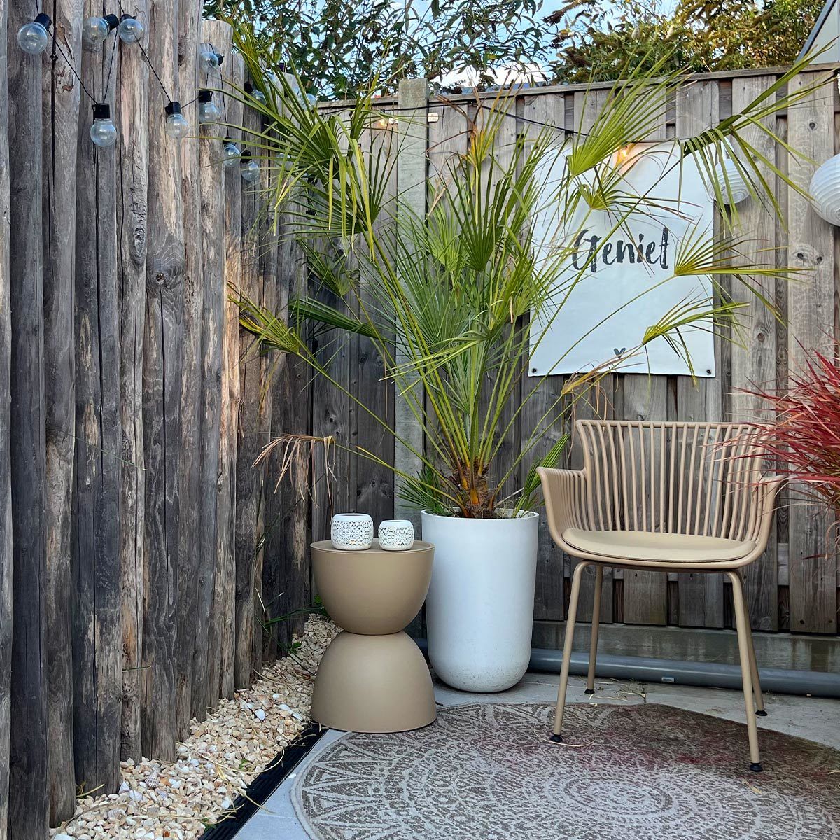 De bijzettafel is vervaardigd uit stevig kunststof en voorzien van een speciale outdoor-coating. Hierdoor kun je TESS zowel binnen als buiten gebruiken en geniet je van een onderhoudsvriendelijk en duurzaam meubelstuk. Ideaal voor zonnige middagen in de tuin, gezellige borrelmomenten op het terras of als praktisch tafeltje naast de bank.