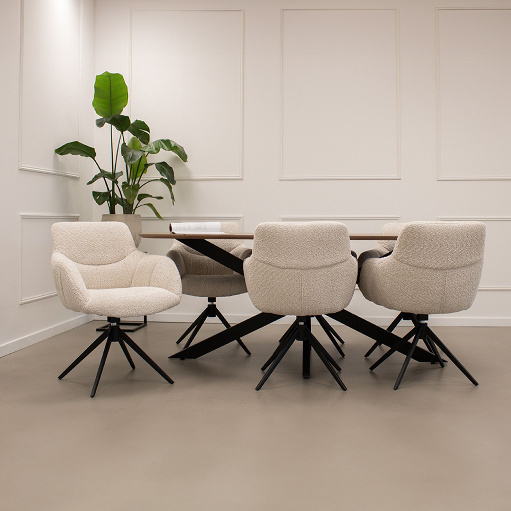 Het praktische 360 graden draaibare onderstel maakt Fer niet alleen mooi, maar ook functioneel. En handig: het frame draait automatisch terug naar de originele positie, ideaal voor een opgeruimde look rondom de tafel. Of je nu urenlang wilt tafelen of lekker wilt borrelen met vrienden, met Fer zit je altijd goed.