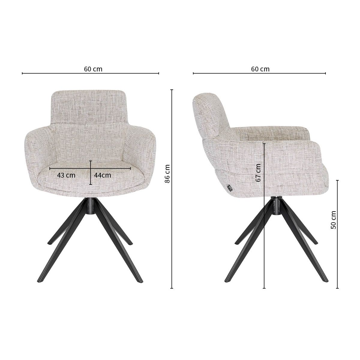 Waarom draaistoel LIVA een musthave is: - Zachte, gemêleerde textuurstof met luxe uitstraling - Volle zitvulling voor optimaal zitcomfort - Comfortabele rugleuning en ondersteunende armleuningen - 360 graden draaibaar onderstel met automatische terugdraaifunctie - Stevig zwart metalen onderstel - Verkrijgbaar in 2 stijlvolle kleuren