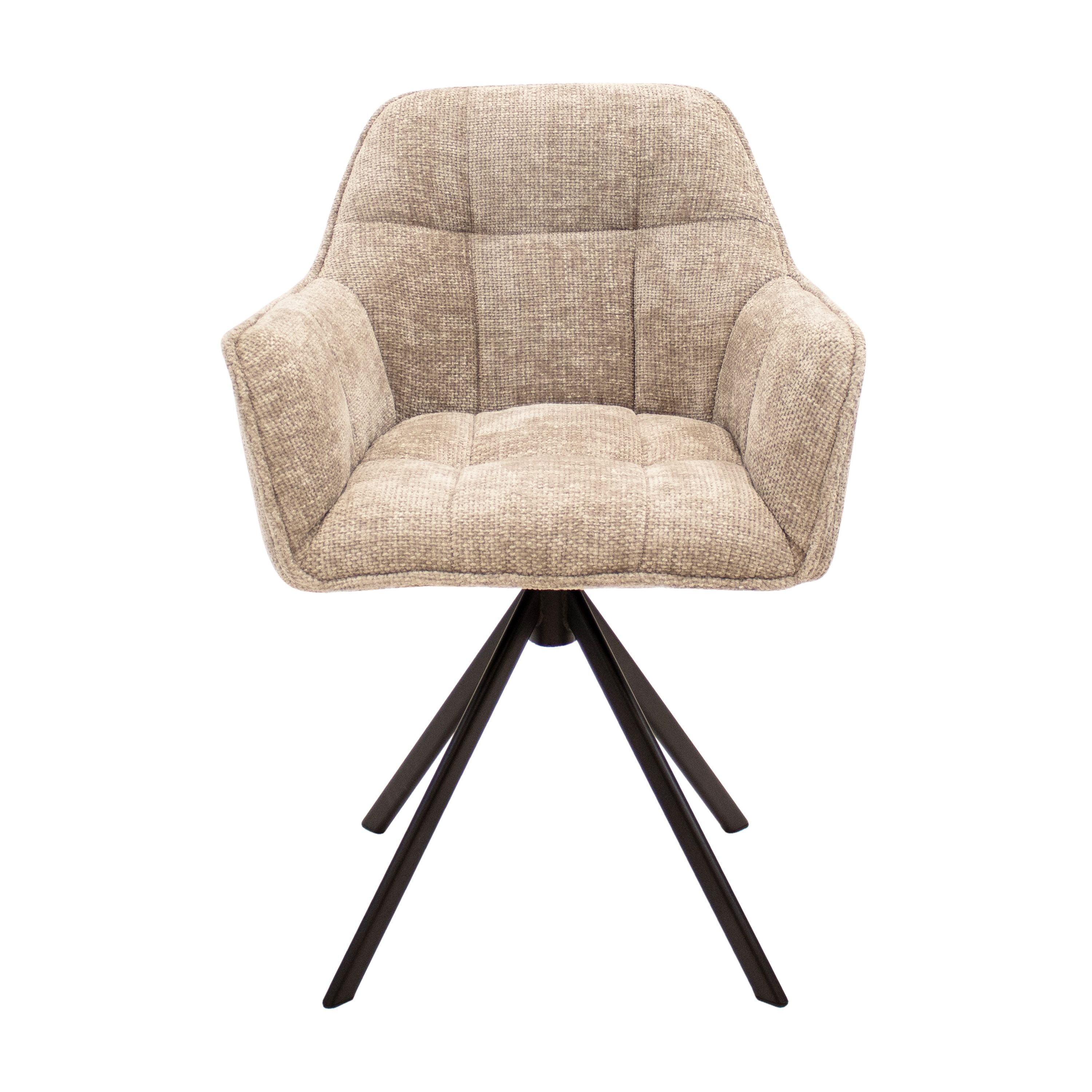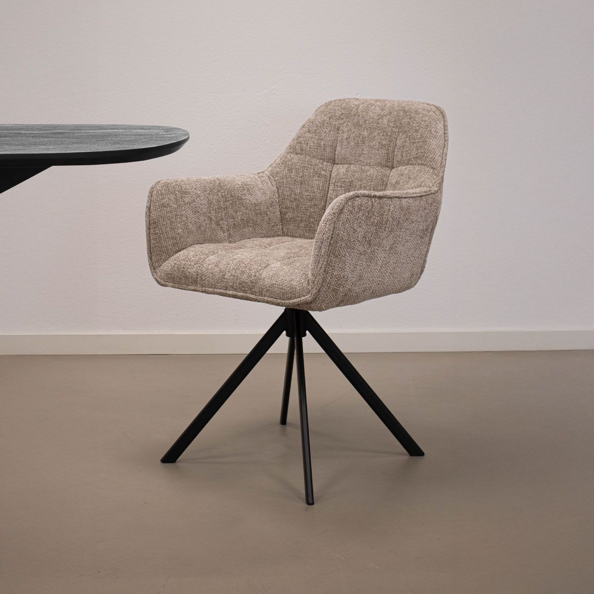 LUC is de perfecte mix van comfort, stijl en functionaliteit. Met zijn 180 graden draaibare onderstel brengt LUC niet alleen bewegingsvrijheid aan tafel, maar ook een moderne flair in jouw interieur. De luxe uitstraling van de grove chenille stof zorgt voor een warme, uitnodigende sfeer, terwijl de armleuningen extra comfort bieden tijdens lange diners of gezellige avonden.