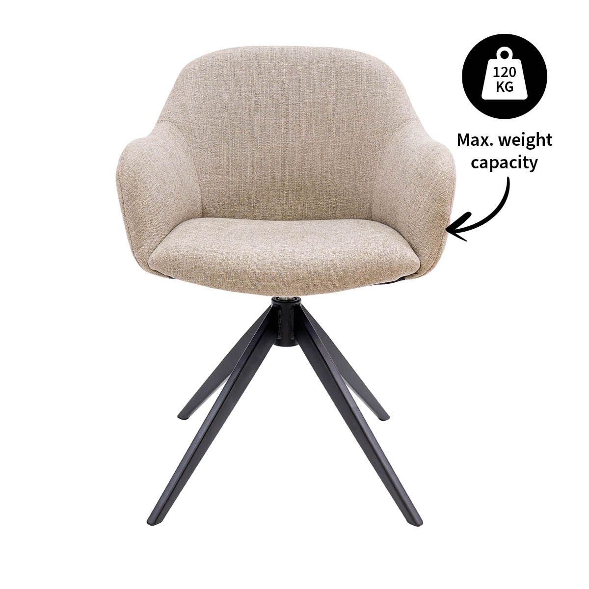 Het 360 graden draaibare onderstel met automatische terugdraaifunctie zorgt voor extra gemak in het dagelijks gebruik. Ideaal tijdens lange diners of een werkdag aan huis. De prachtige horizontale stiknaden aan de achterkant van de rugleuning geven de stoel een speels effect en maken het design net even anders. Het zwarte metalen onderstel vormt een mooi contrast met de zachte stof en geeft NOEL een moderne, luxe uitstraling.