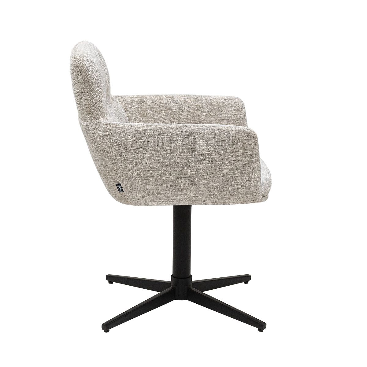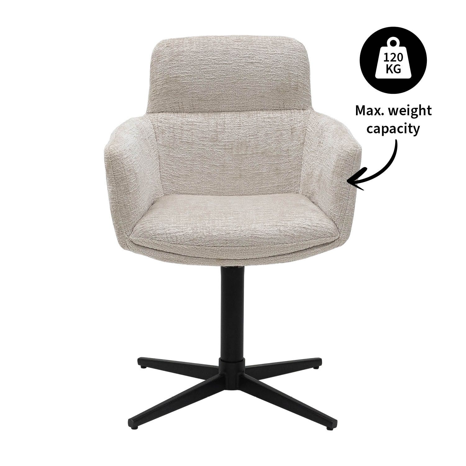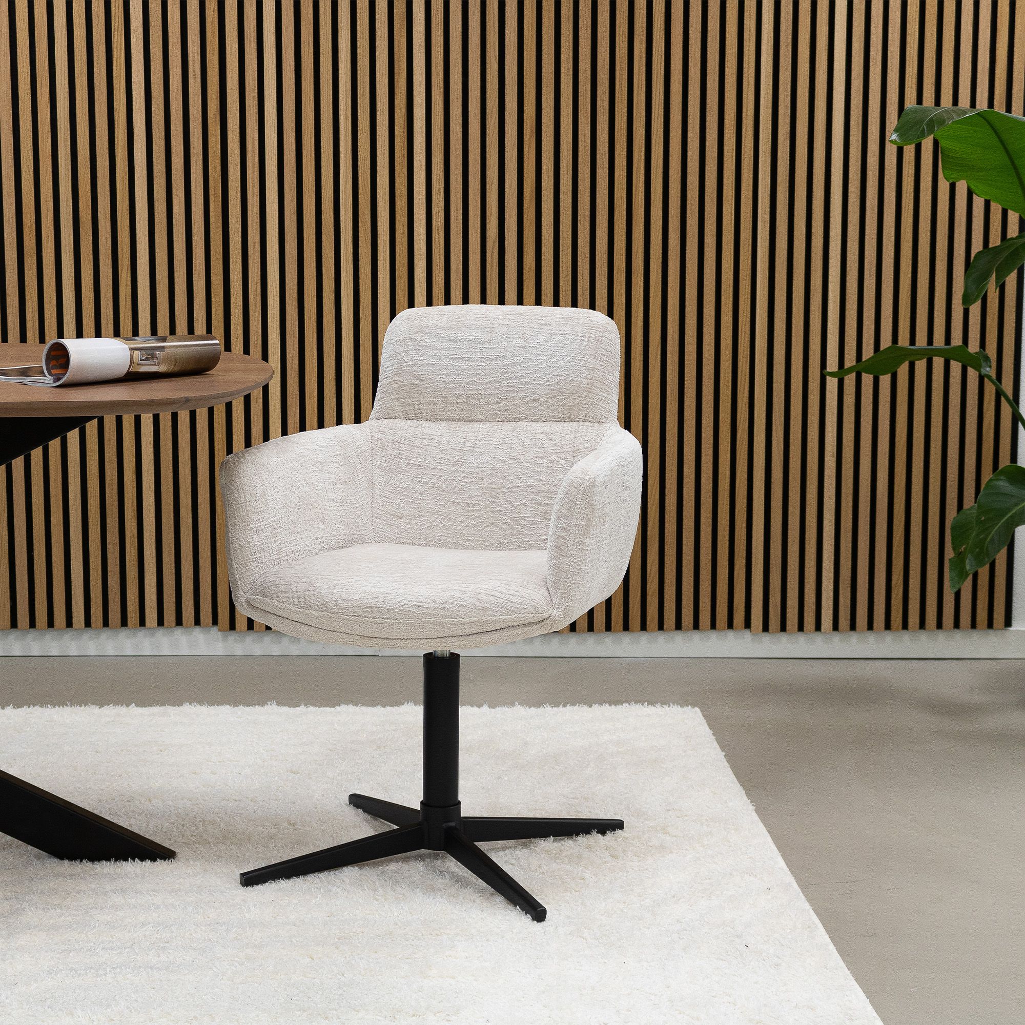 Waarom draaistoel NOUD een echte aanwinst is: - Luxe bekleding van zachte textuurstof - Draaibaar onderstel met automatische terugdraaifunctie - Comfortabele zitting met armleuningen - Stevig en duurzaam design - Verkrijgbaar in meerdere kleuren