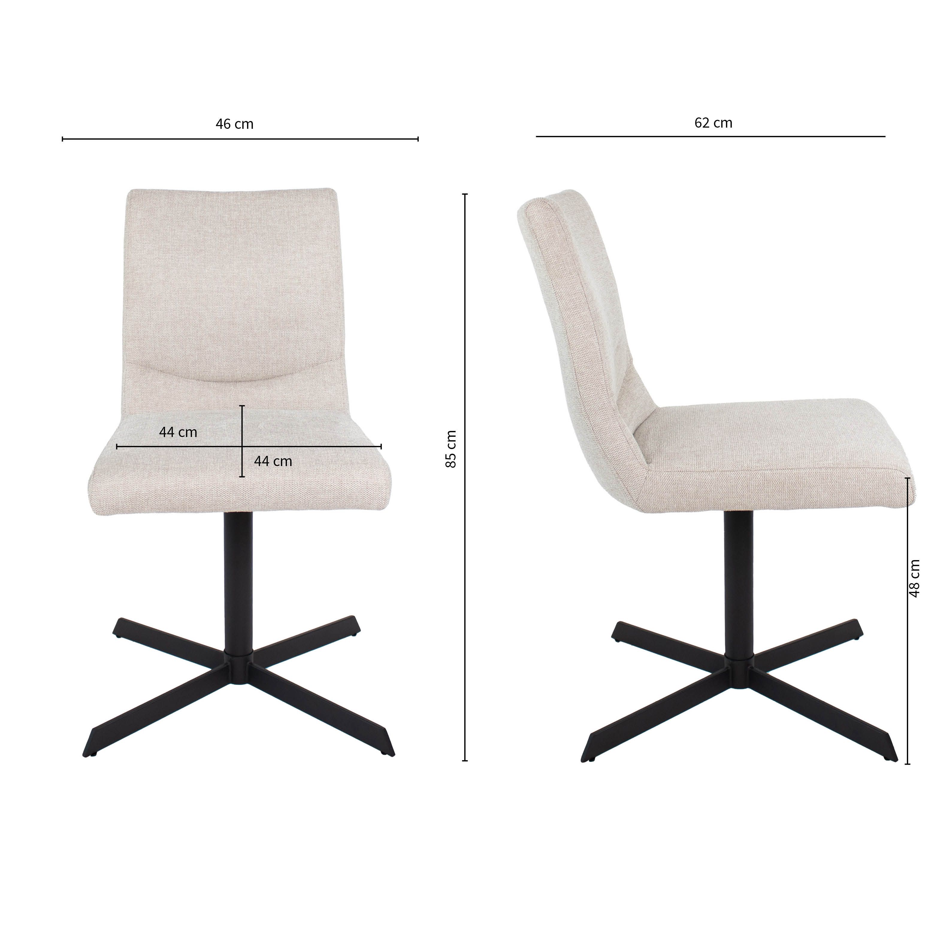 Sam is gestoffeerd met een gemêleerde textuurstof en verkrijgbaar in verschillende kleuren. Het opvallende metalen frame van de stoel is een staaltje van modern design en functionaliteit. Het frame is voorzien van een 360-graden draaimechanisme, waardoor je soepel kunt bewegen en gemakkelijk kunt aanschuiven aan de eettafel of een gesprek kunt voeren zonder de stoel te verschuiven.