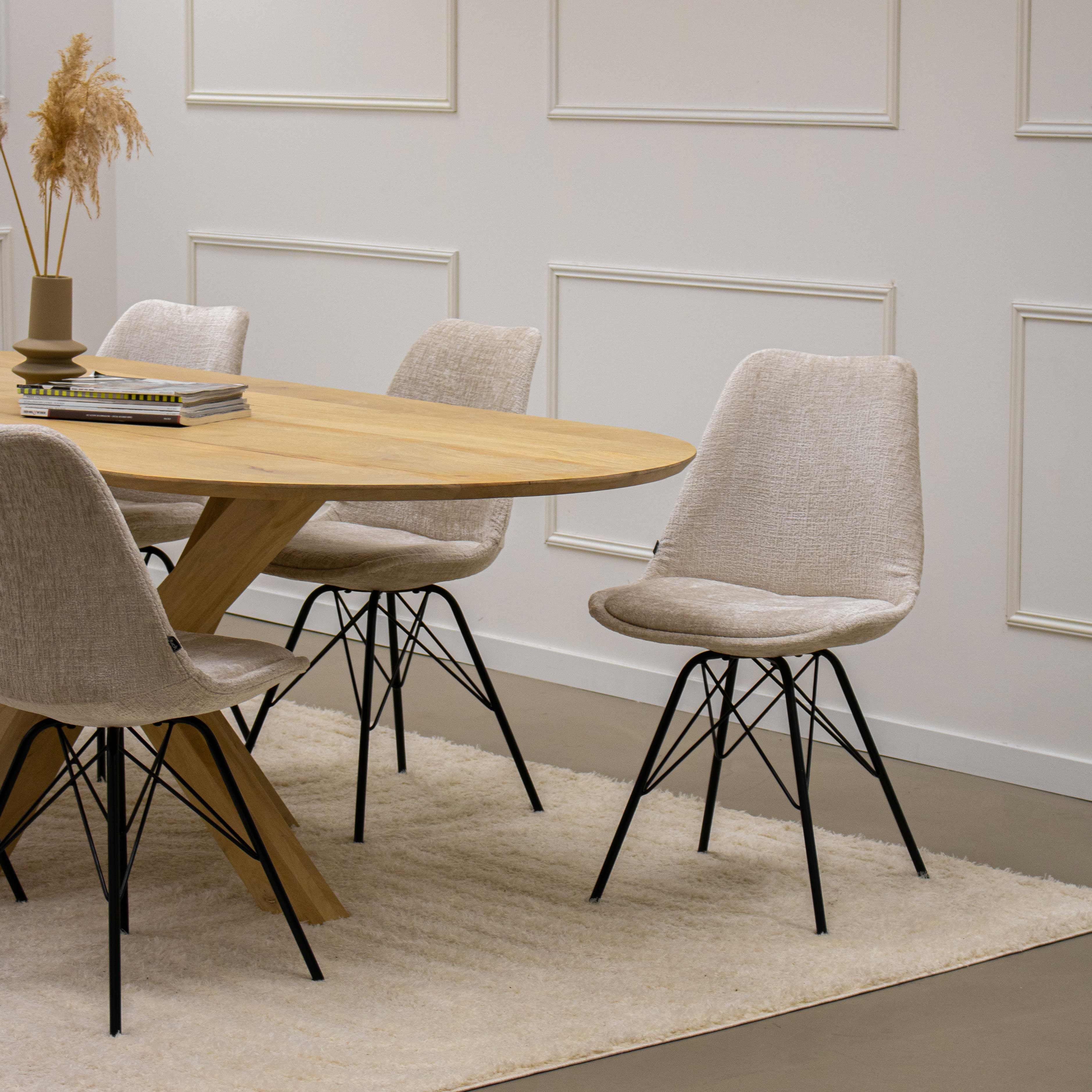 Eerder hadden wij ditzelfde model met velvet stof, jarenlang plezier van gehad, nog steeds leuk toch wilde we wat anders en hoe leuk dat ze nu onze fijne stoelen ook met een andere stof hebben! Leuke kleuren, wij zijn voor grijs gegaan, past helemaal leuk in ons interieur.