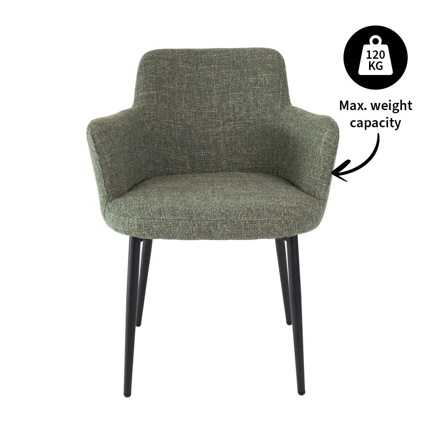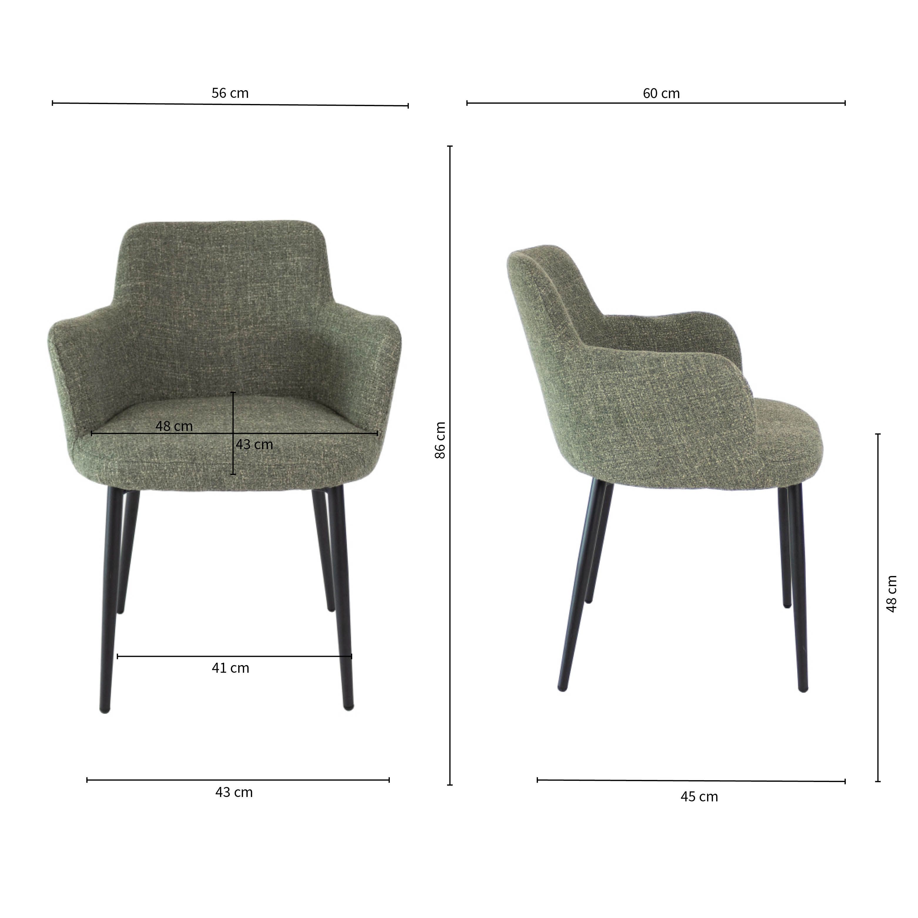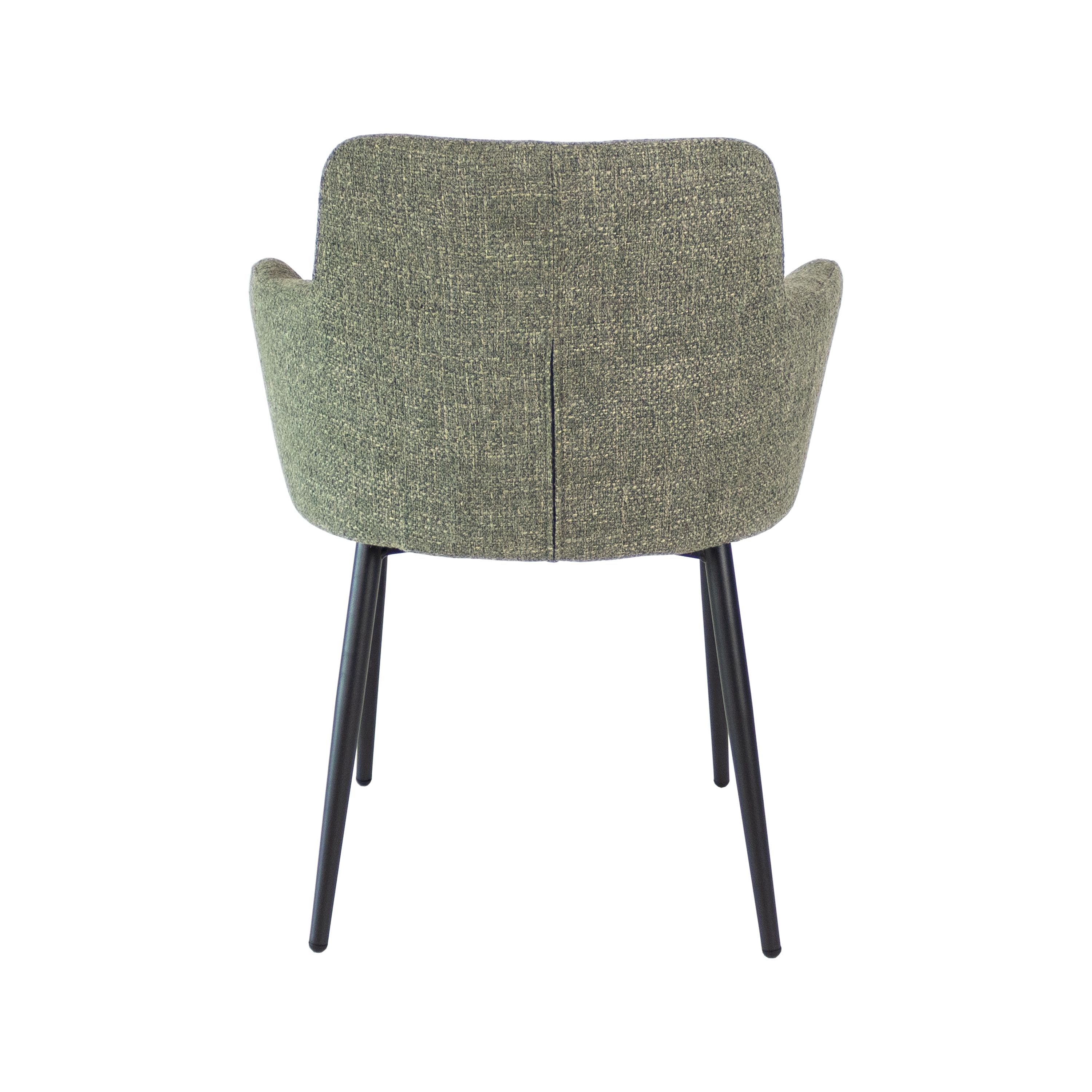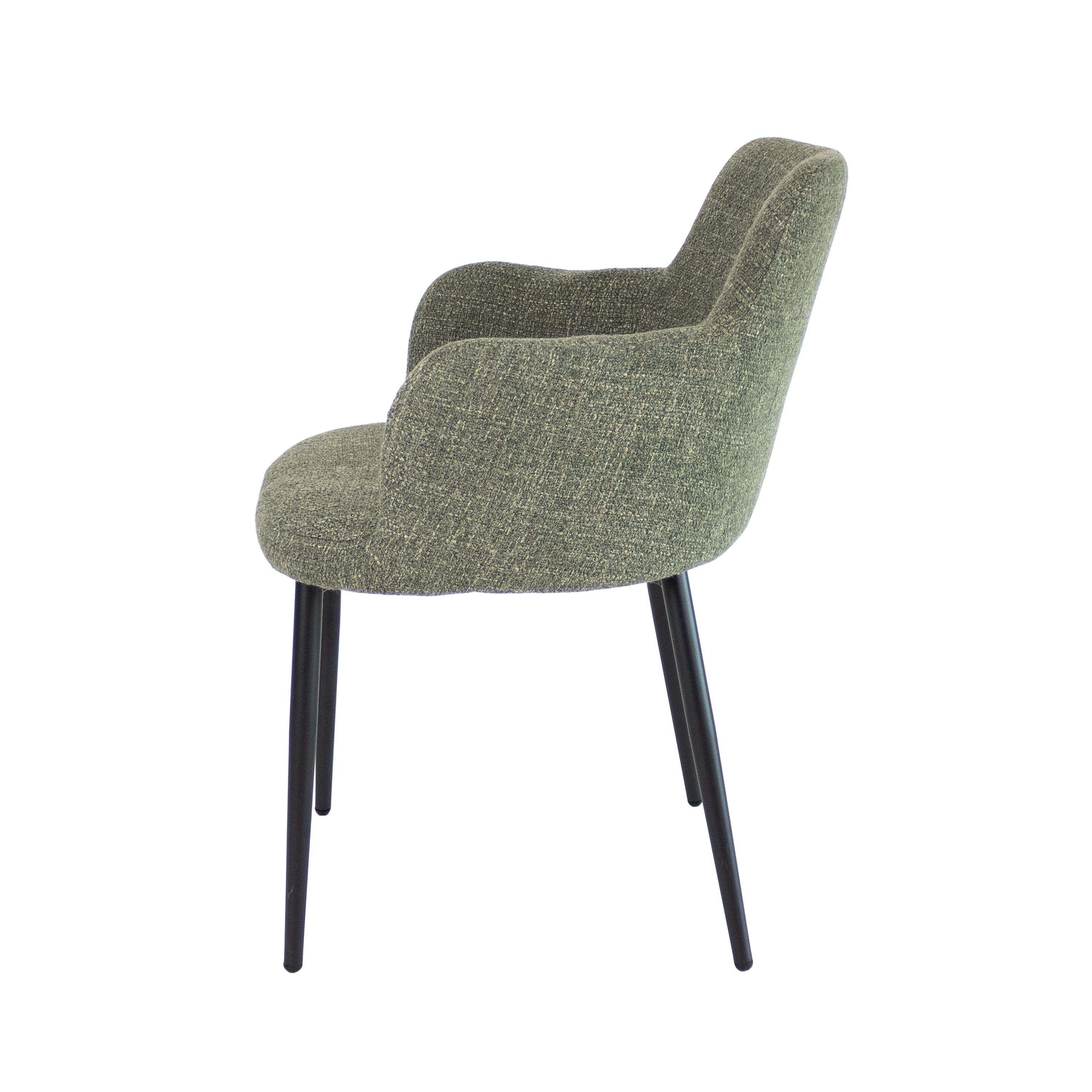 Ontdek de veelzijdige Eetkamerstoel Emma. Met een uitnodigende textuurstof, stoer zwart metalen onderstel en eigentijds aflopende armleuningen, straalt Emma elegantie uit. Beschikbaar in 4 hippe kleuren. Emma is niet alleen comfortabel, maar is ook een stijlvolle aanvulling op je interieur.