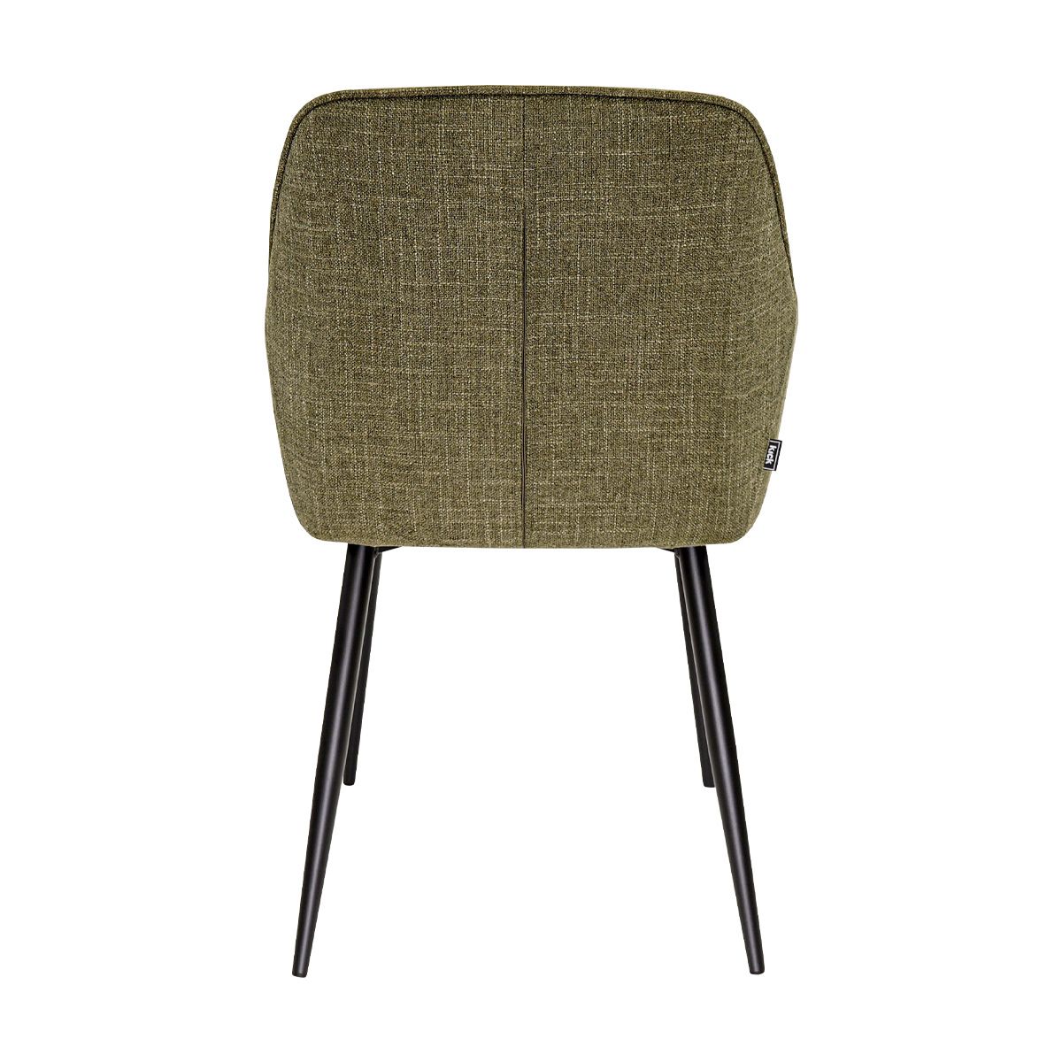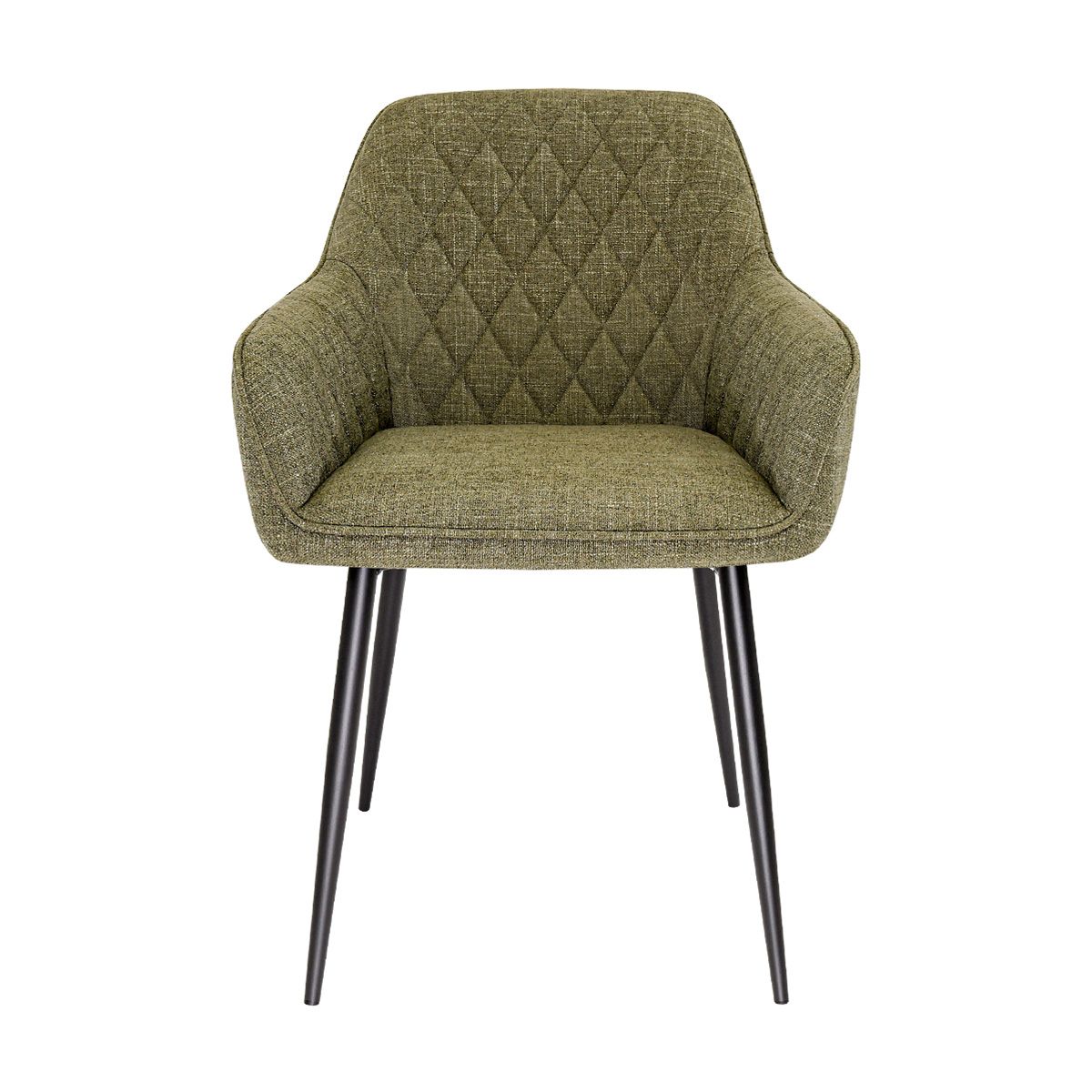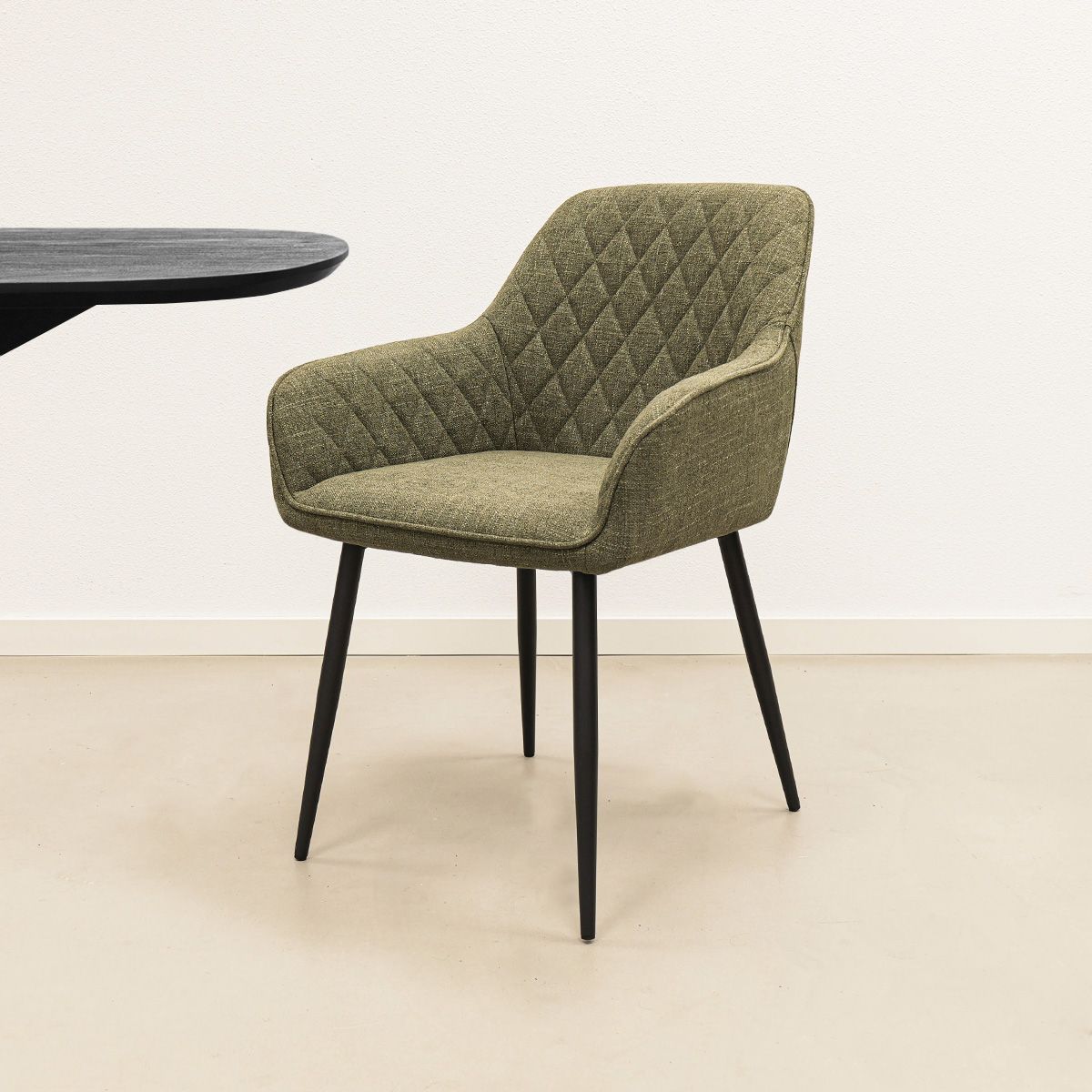 De afgeronde armleuningen zorgen voor een comfortabele en uitnodigende zit, terwijl de goede rugleuning optimale ondersteuning biedt tijdens lange diners. In de rugleuning zorgen de stiksels in een speels ruitpatroon voor een subtiel maar opvallend detail. De paspelband langs de rugleuning en armleuningen versterkt het luxe karakter en geeft de stoel een verfijnde afwerking. De fijne texturestof voelt zacht aan en draagt bij aan het comfortabele, hoogwaardige zitgevoel.