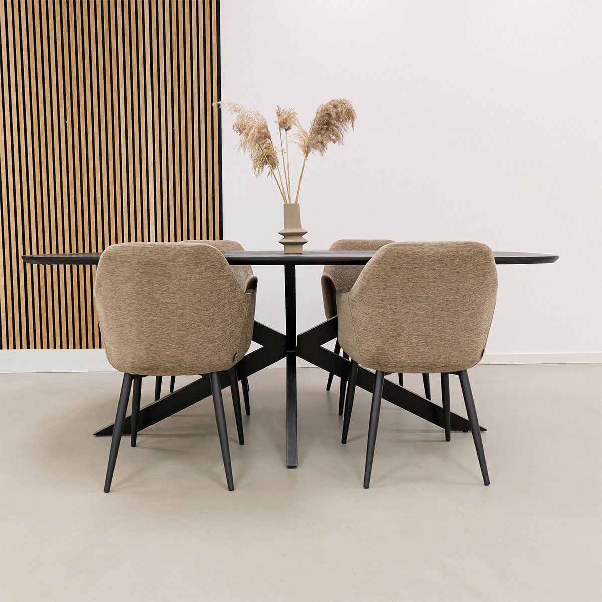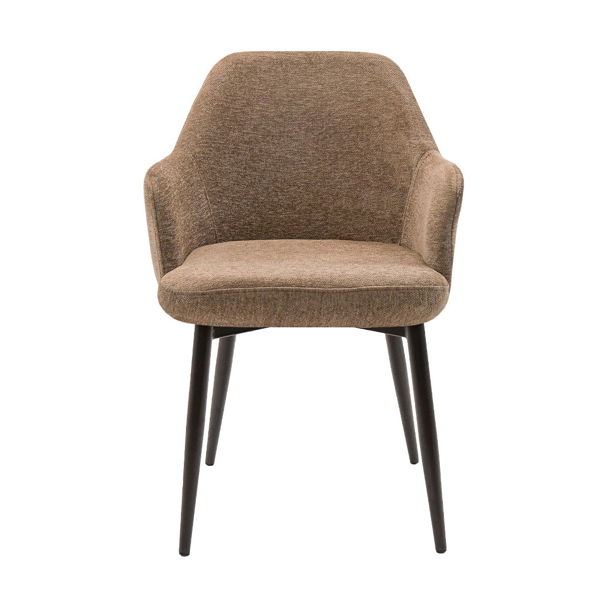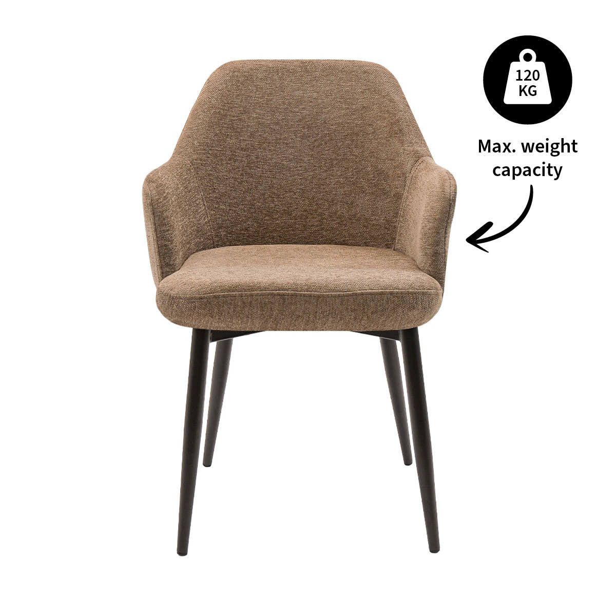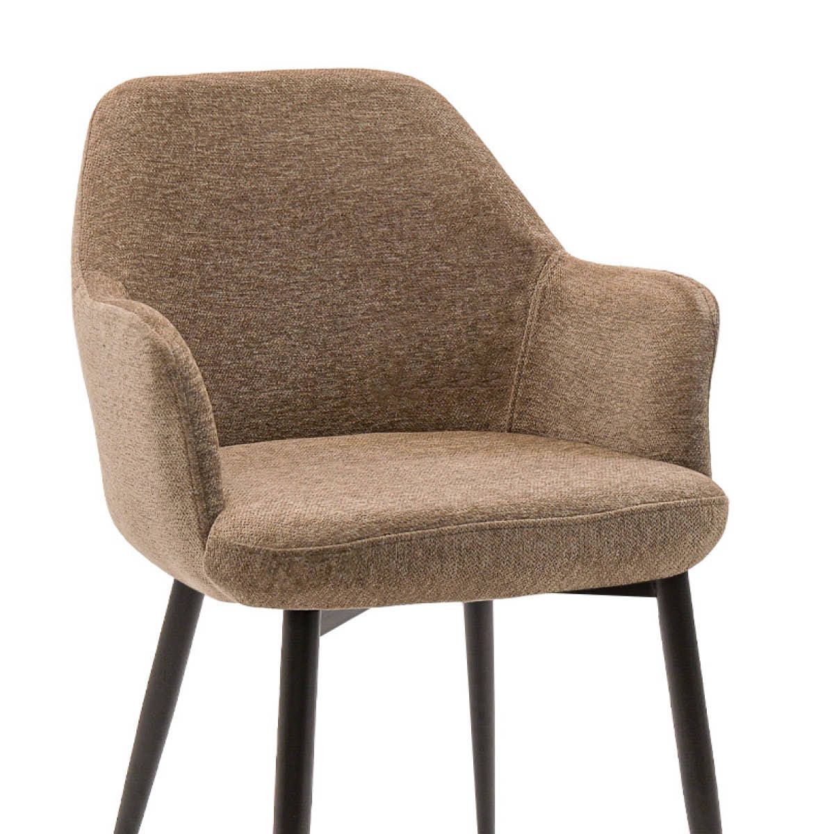 De zachte textuurstof voelt prettig aan en geeft JODI een luxe, uitnodigende uitstraling. Dankzij de ruime, comfortabele zitting en de fijn gevormde armleuningen zit je altijd ontspannen, ook tijdens lange diners. Het metalen onderstel met zwart matte afwerking zorgt voor een stoer contrast en maakt het strakke ontwerp helemaal af. JODI is verkrijgbaar in verschillende kleuren, waardoor hij moeiteloos aansluit bij jouw interieurstijl.