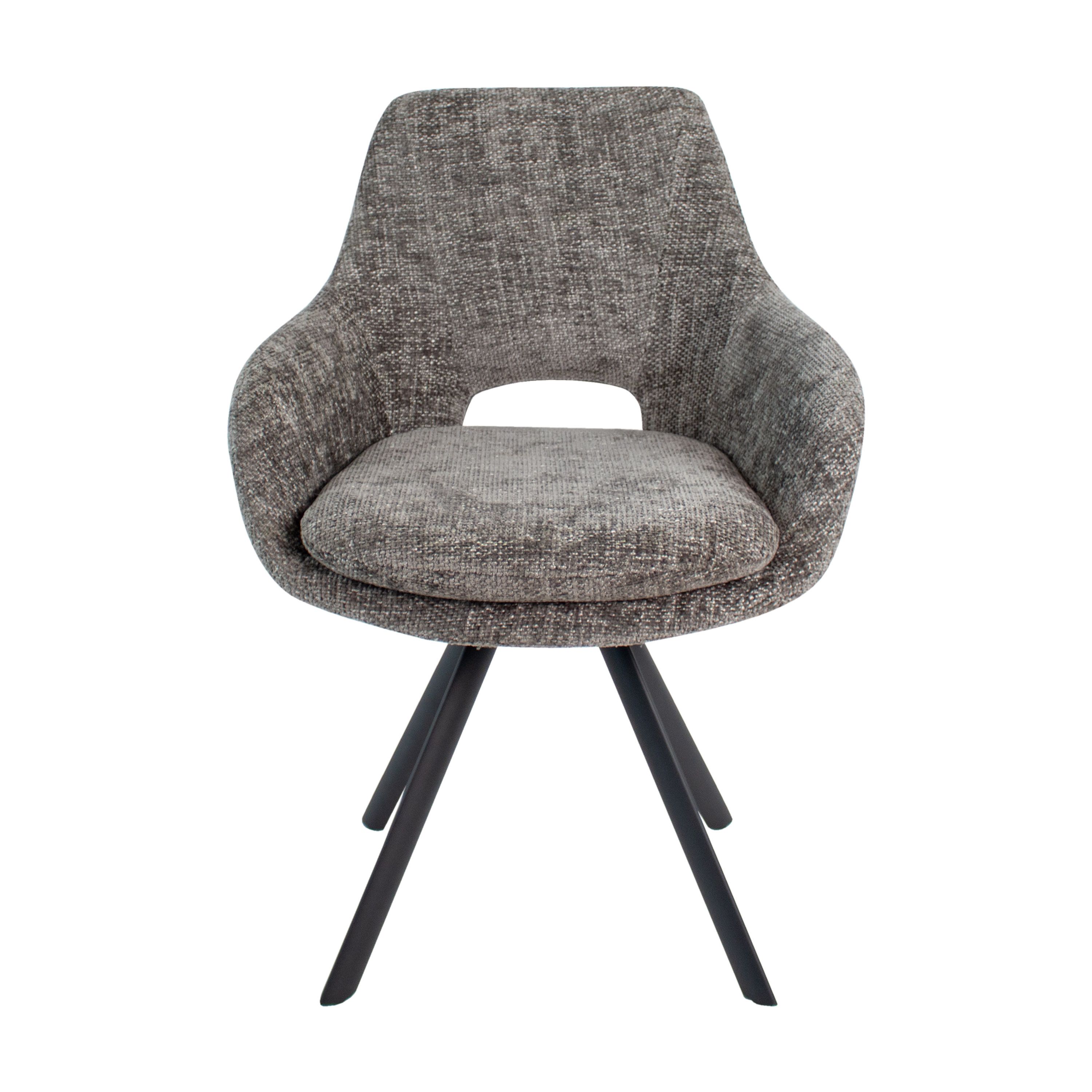 Het zwart metalen onderstel zorgt voor een eigentijdse uitstraling, terwijl de subtiele opening in de rugleuning een vleugje karakter toevoegt.