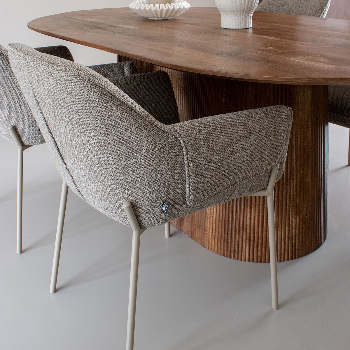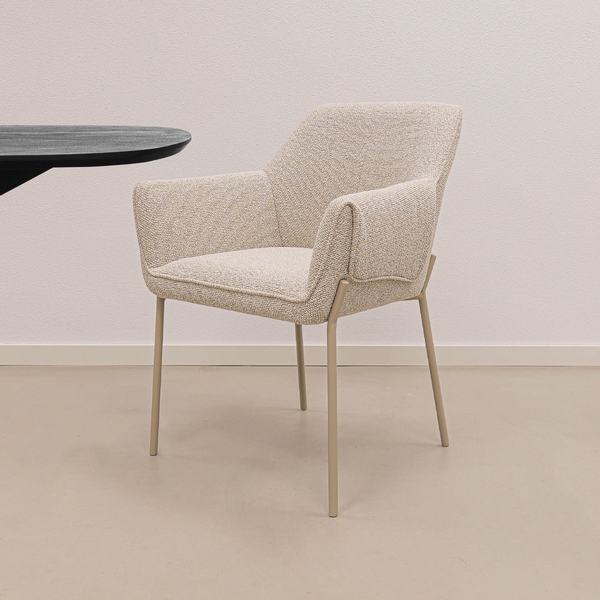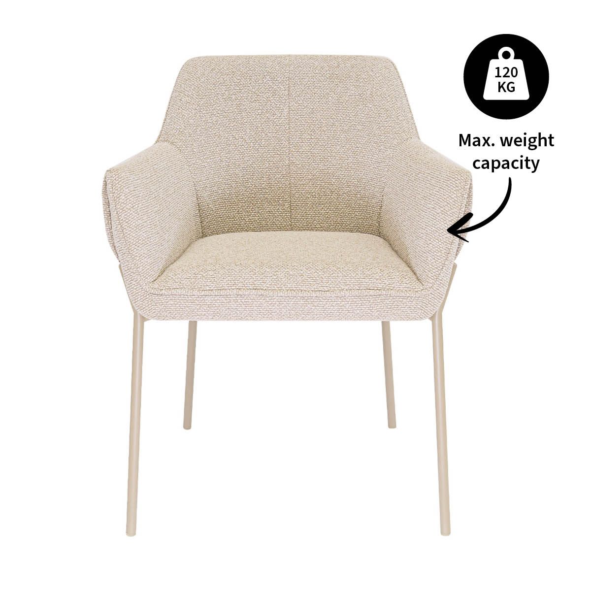 De comfortabele armleuningen bieden fijne ondersteuning tijdens lange diners. De strakke vormgeving in combinatie met de bijzondere omslag van de armleuningen geeft de stoel een stoer karakter, terwijl de zachte texture stof en het verfijnde stiksel in de rugleuning juist zorgen voor een elegante en luxe uitstraling. De fijne rugleuning draagt bij aan een prettig zitcomfort, perfect voor gezellige avonden aan tafel.