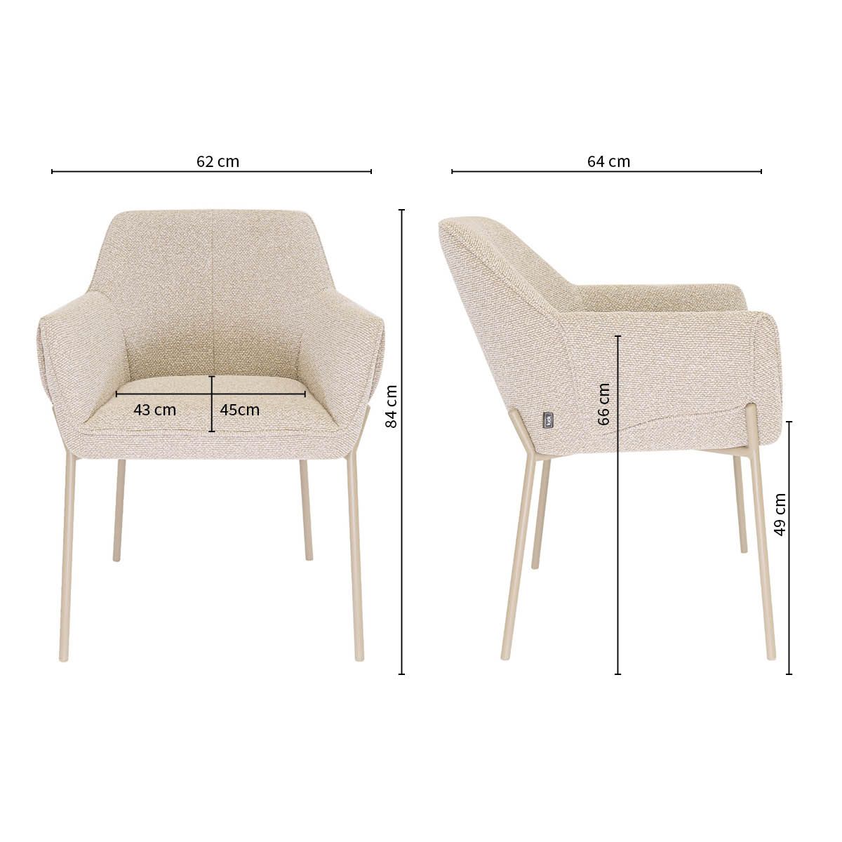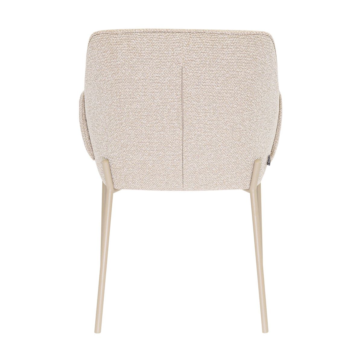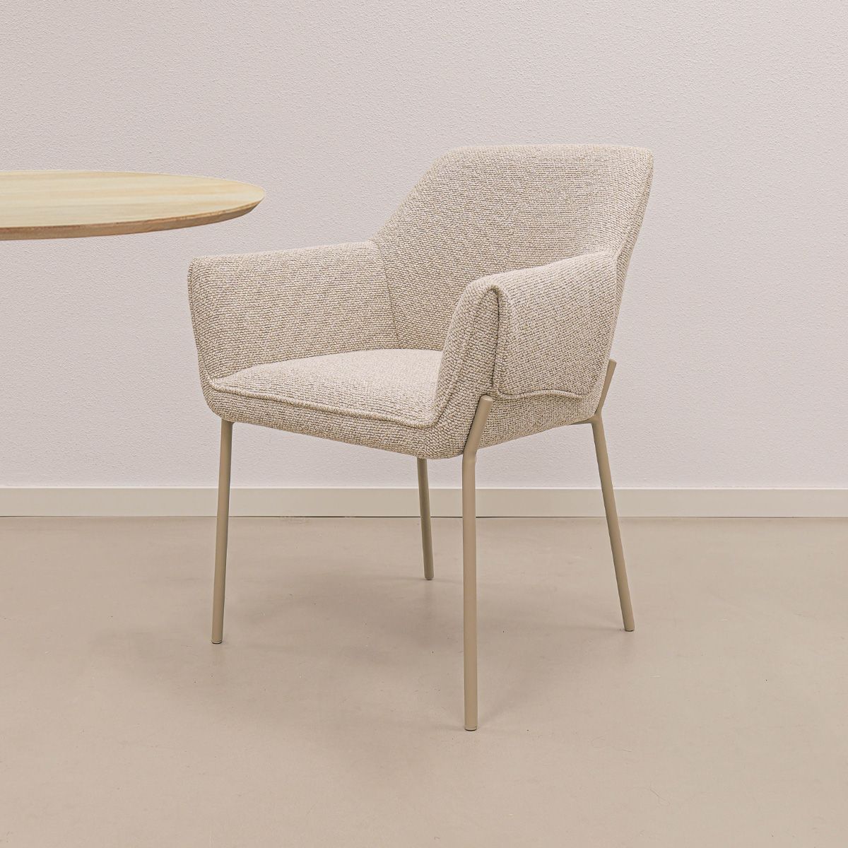 De comfortabele armleuningen bieden fijne ondersteuning tijdens lange diners. De strakke vormgeving in combinatie met de bijzondere omslag van de armleuningen geeft de stoel een stoer karakter, terwijl de zachte texture stof en het verfijnde stiksel in de rugleuning juist zorgen voor een elegante en luxe uitstraling. De fijne rugleuning draagt bij aan een prettig zitcomfort, perfect voor gezellige avonden aan tafel.