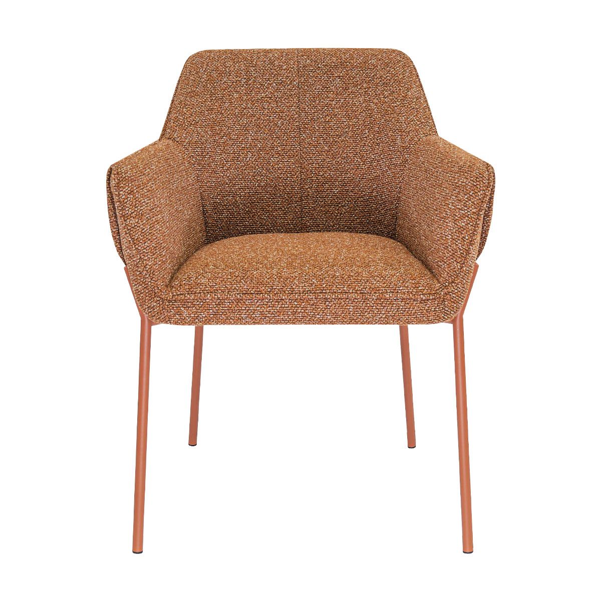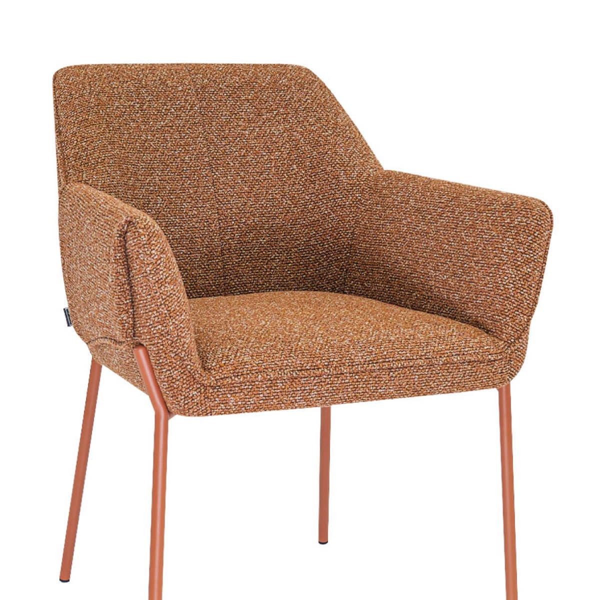 De comfortabele armleuningen bieden fijne ondersteuning tijdens lange diners. De strakke vormgeving in combinatie met de bijzondere omslag van de armleuningen geeft de stoel een stoer karakter, terwijl de zachte texture stof en het verfijnde stiksel in de rugleuning juist zorgen voor een elegante en luxe uitstraling. De fijne rugleuning draagt bij aan een prettig zitcomfort, perfect voor gezellige avonden aan tafel.
