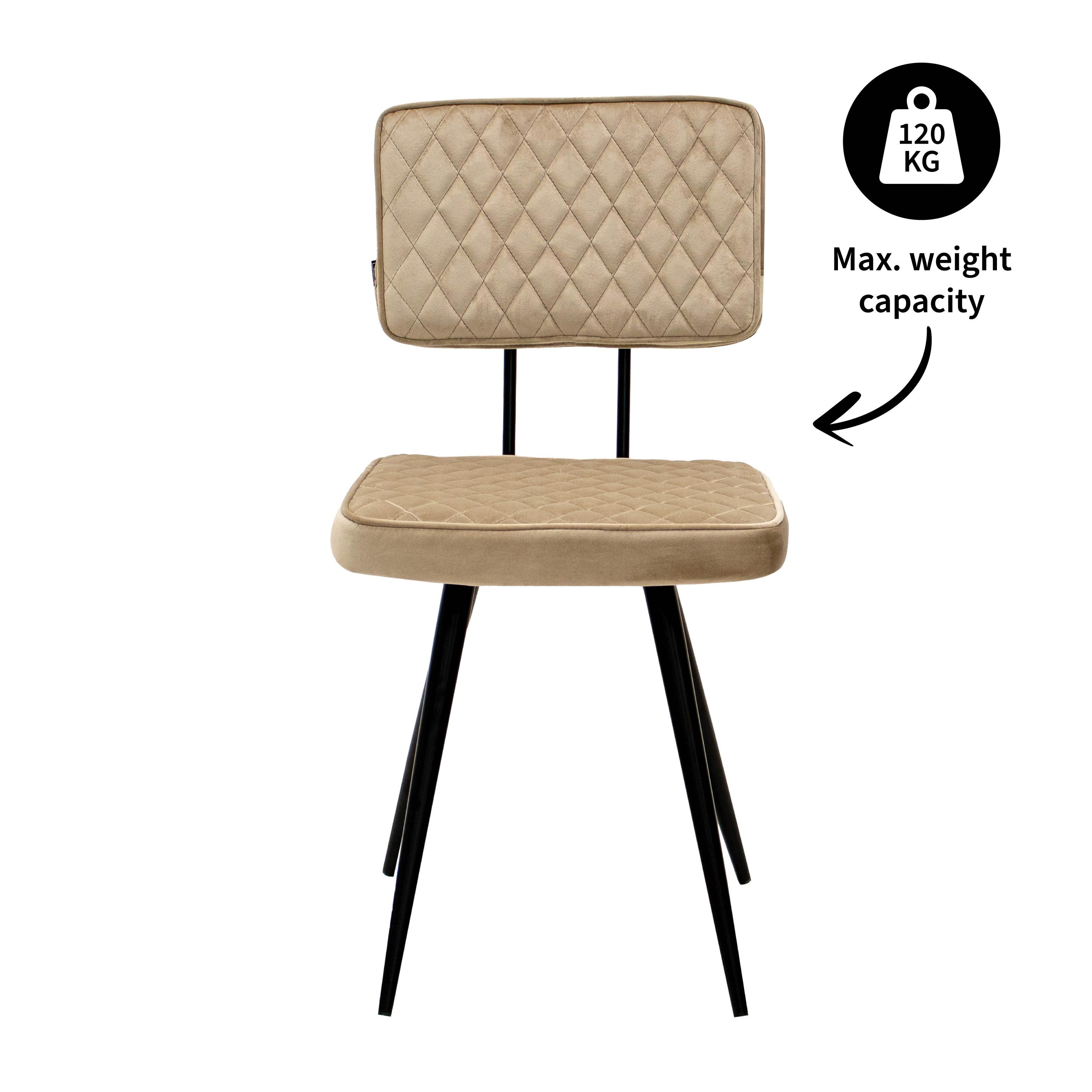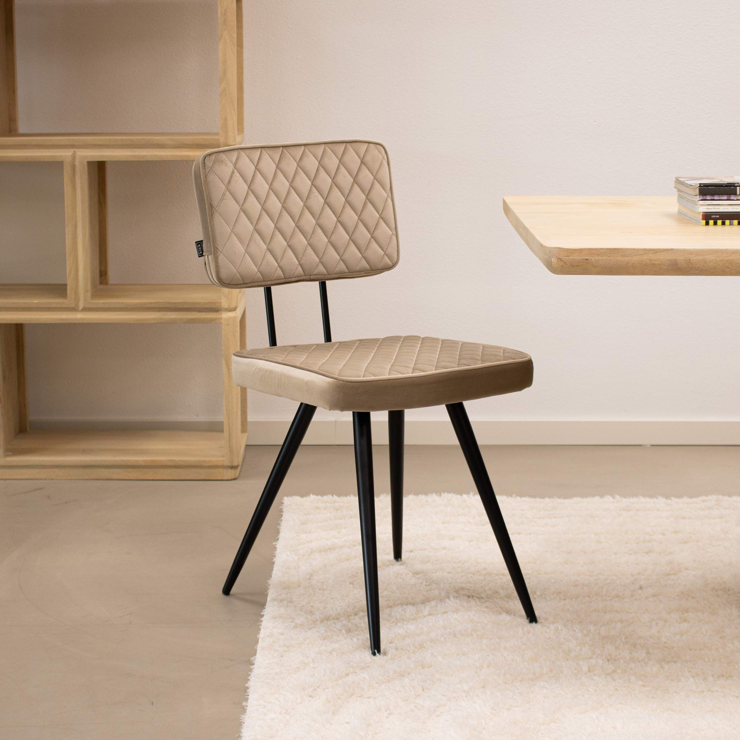 Maak kennis met eetkamerstoel Toby! Toby is de perfecte combinatie van retro en chique. Zowel het rug- als zitkussen is bekleed met onze vertrouwde velvet stof, de stiksels in de vorm van ruitjes maken de stoel een echte blikvanger! Deze toffe stoel heeft een hoogwaardig zitcomfort door de goed gevulde kussens en een stevig metalen frame met elegante ronde poten wat zorgt voor een lange levensduur. Toby is verkrijgbaar in een scala aan kleuren wat de stoel helemaal Kick maakt. Mix and match voor het ultieme resultaat!