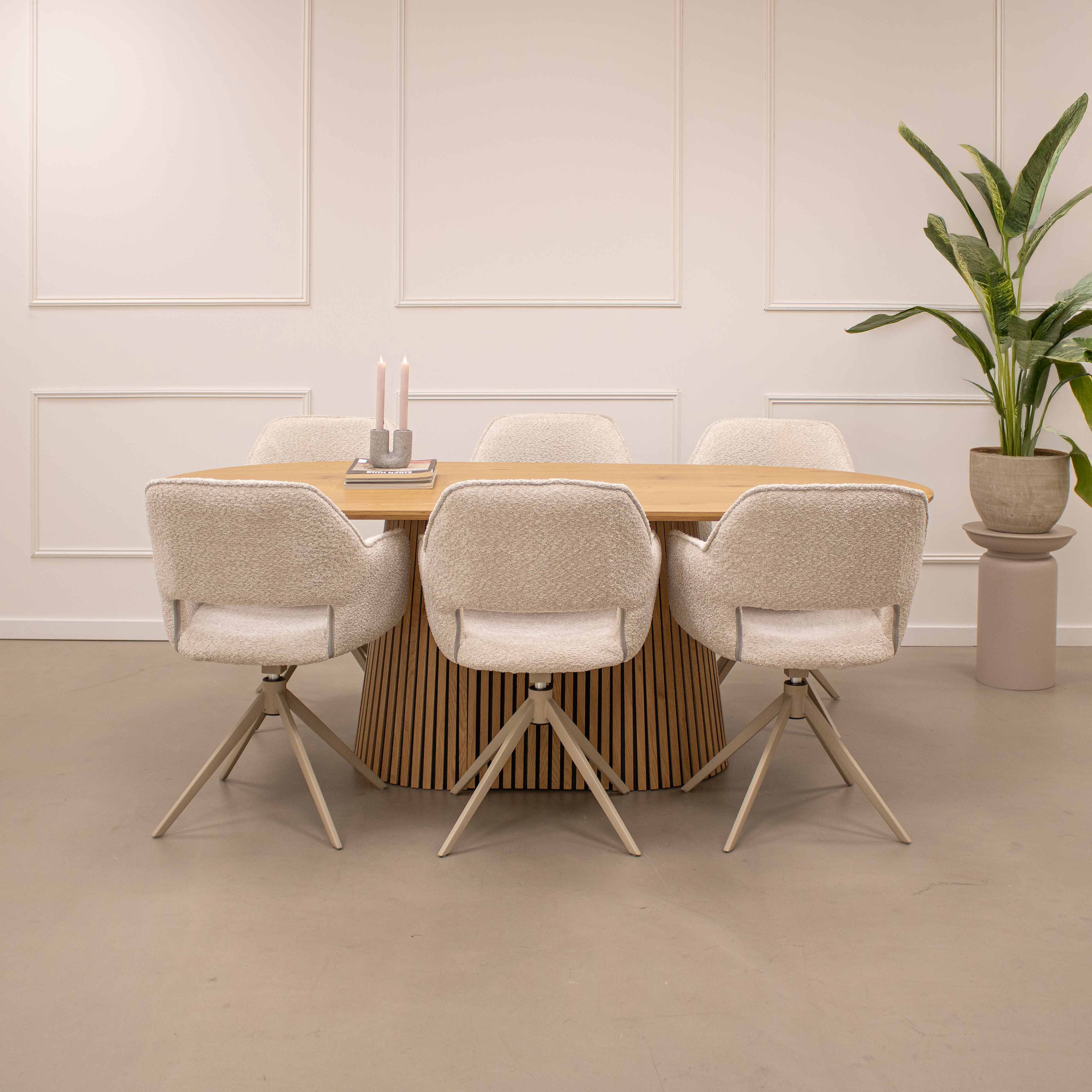 Maak kennis met eettafel Mika ovaal! Met zijn eikenhouten-look en ovale vorm brengt Mika de Scandinavische sfeer naar jouw eetkamer. Mika is gemaakt van hoogwaardig MDF en melamine wat zeer gebruiksvriendelijk is in onderhoud. De unieke poot is omringd door latjes wat een vleugje design toevoegt aan elke maaltijd.