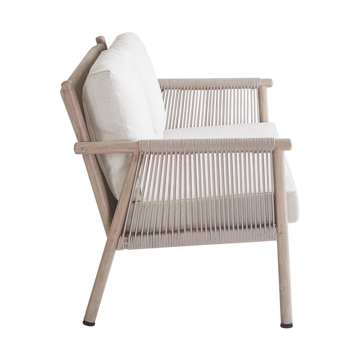 Het frame van de tuinbank is gemaakt van metaal met een houtlook afwerking en de rug- en armleuningen zijn bekleed met een zeer stevig veterkoord wat zich kenmerkt met het ‘quick dry’ systeem waardoor de bank snel droogt na een eventuele regenbui. De bank heeft comfortabele (afneembare) zit- en rug kussens waardoor je extra lang kunt genieten van het buitenleven.