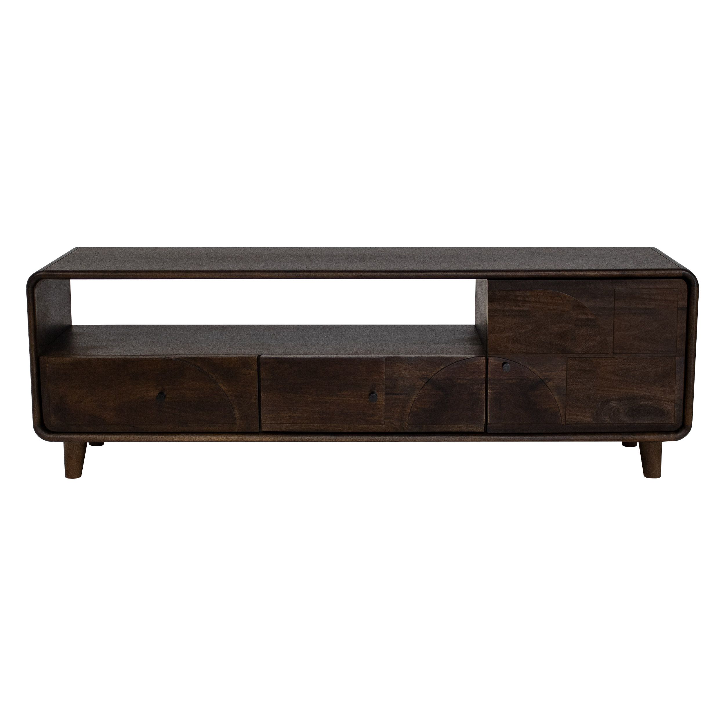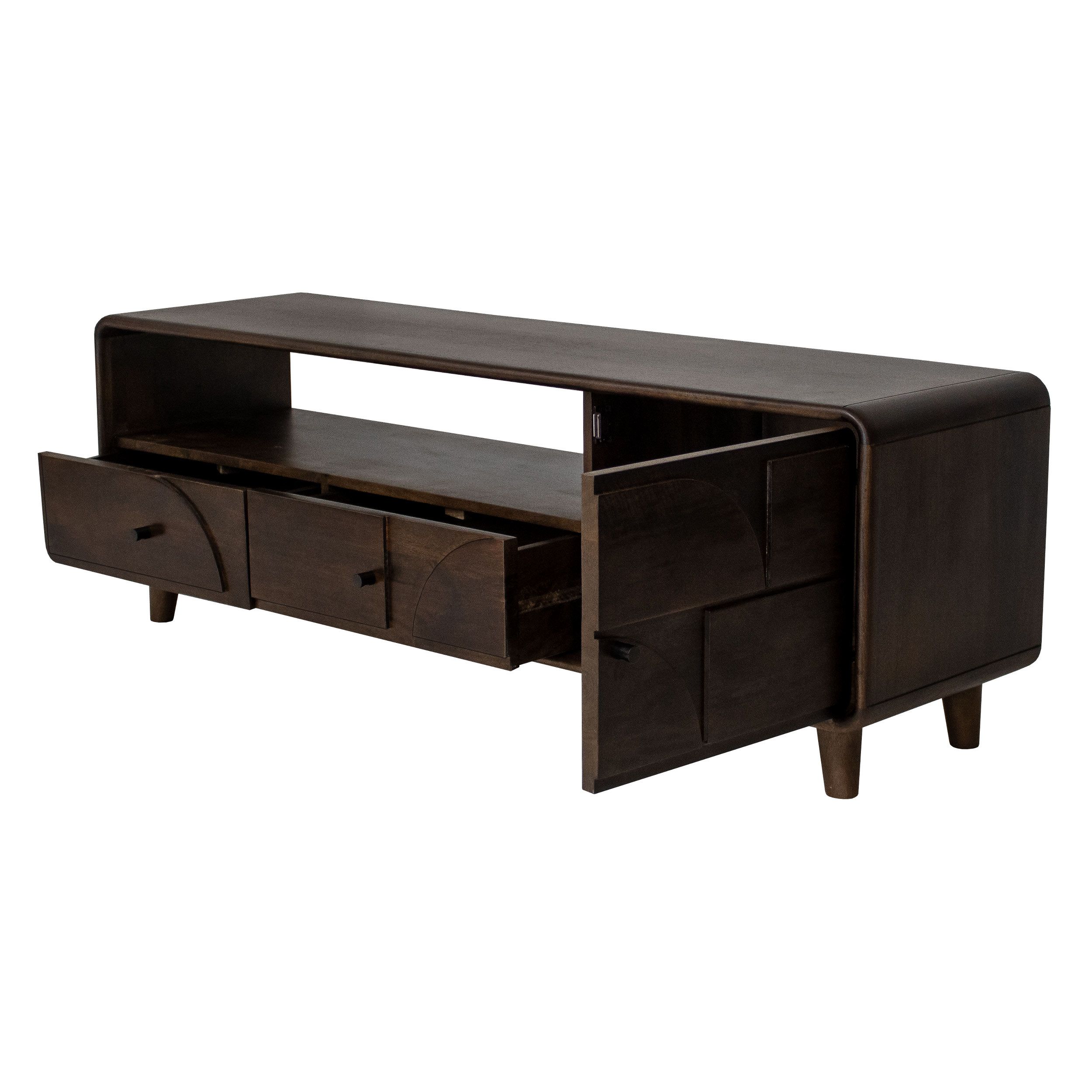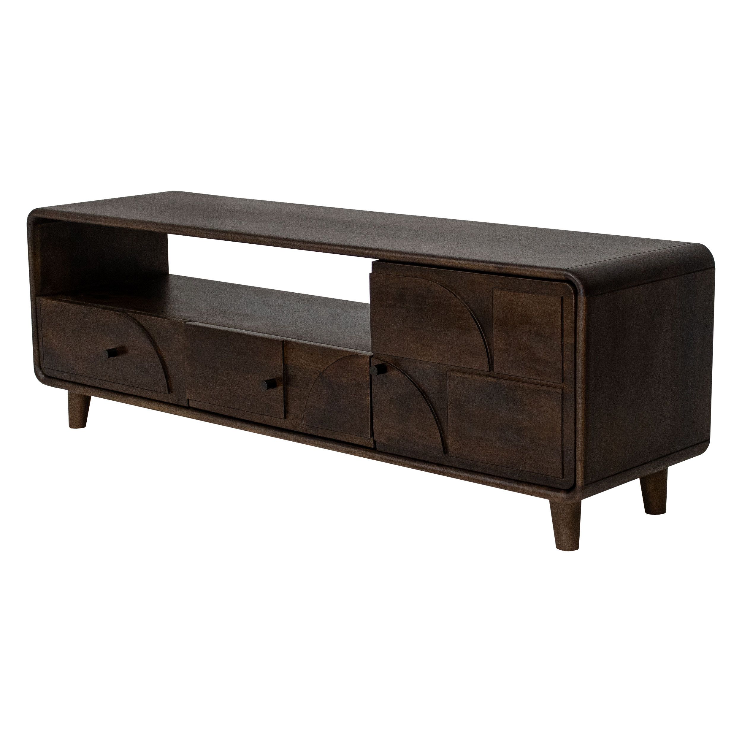 Check out Gustav! Tv-dressoir Gustav is een unieke, moderne kast gemaakt van duurzaam mangohout. De kast is rond afgewerkt en staat stabiel op zijn pootjes. De unieke vormen op de kastdeuren maken het dressoir een echte eyecatcher. Naast dat Gustav een stijlvolle toevoeging is in jouw interieur biedt de kast voldoende opbergruimte wat hem ook nog eens erg functioneel maakt. Tv-dressoir Gustav heeft een open vak, 2 lades en 1 ruim vak met een deurtje ervoor. De kastdeuren sluiten met een soft close systeem waardoor de kast prettig is in gebruik.