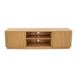 MEET LARS! Met TV-dressoir LARS geef je een warme sfeer aan de woonkamer. Het tv-meubel biedt veel opbergruimte dankzij de 2 deuren en de 2 open vakken. Dankzij de uitsparingen werk je je kabels gemakkelijk weg. De verticale latten op de deurtjes geven de kast een unieke uitstraling. LARS is erg stabiel en stevig doordat hij volledig vlak op de grond staat. Hierdoor zet je er met een gerust hart jouw TV op. Praktisch en stijlvol, dat is LARS!