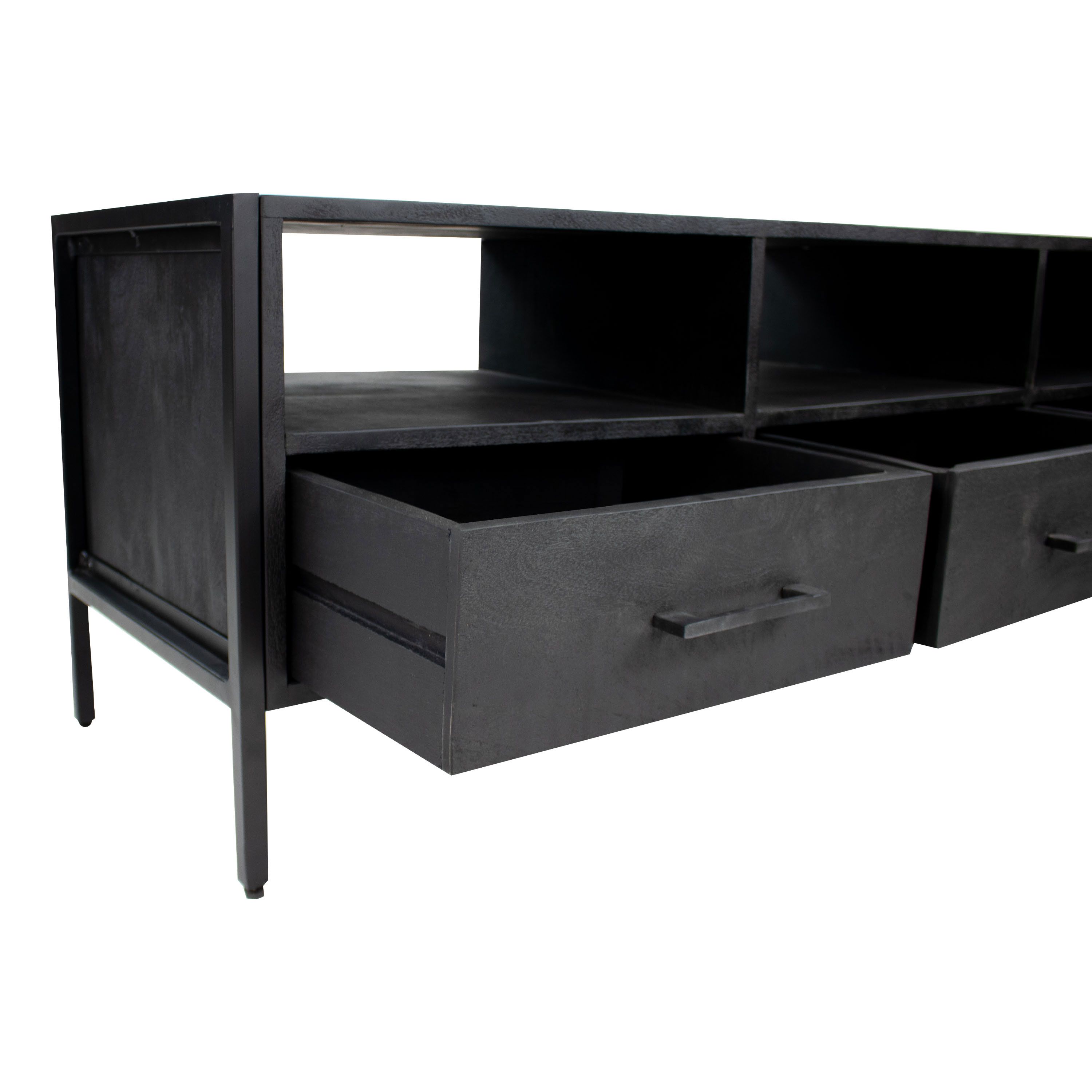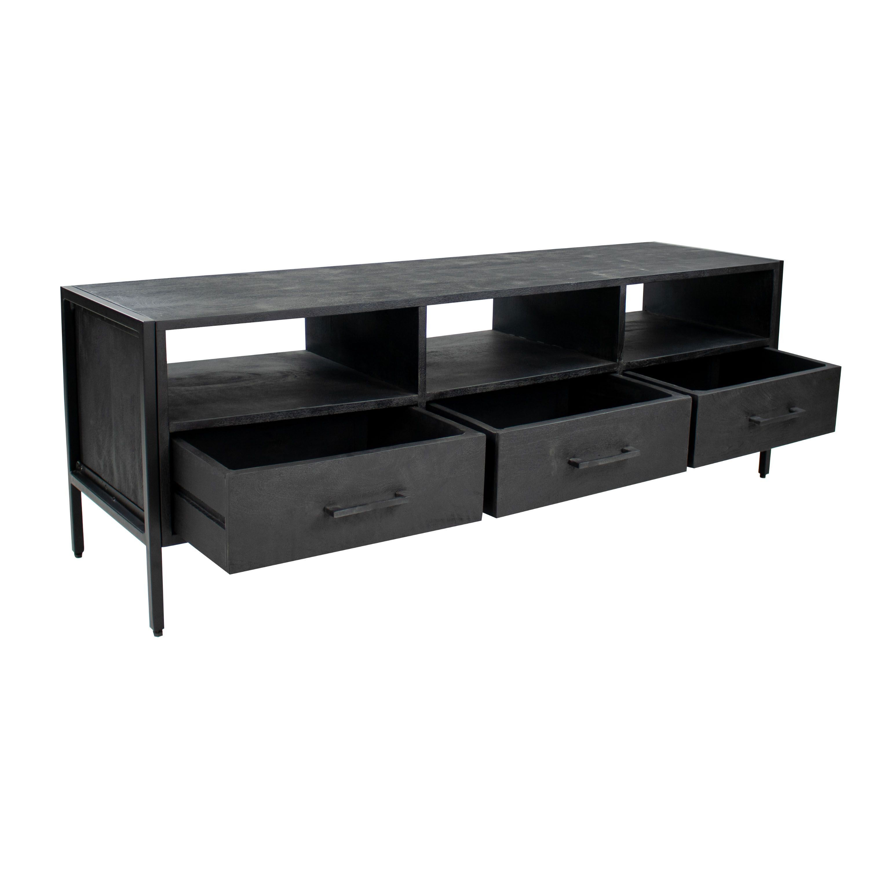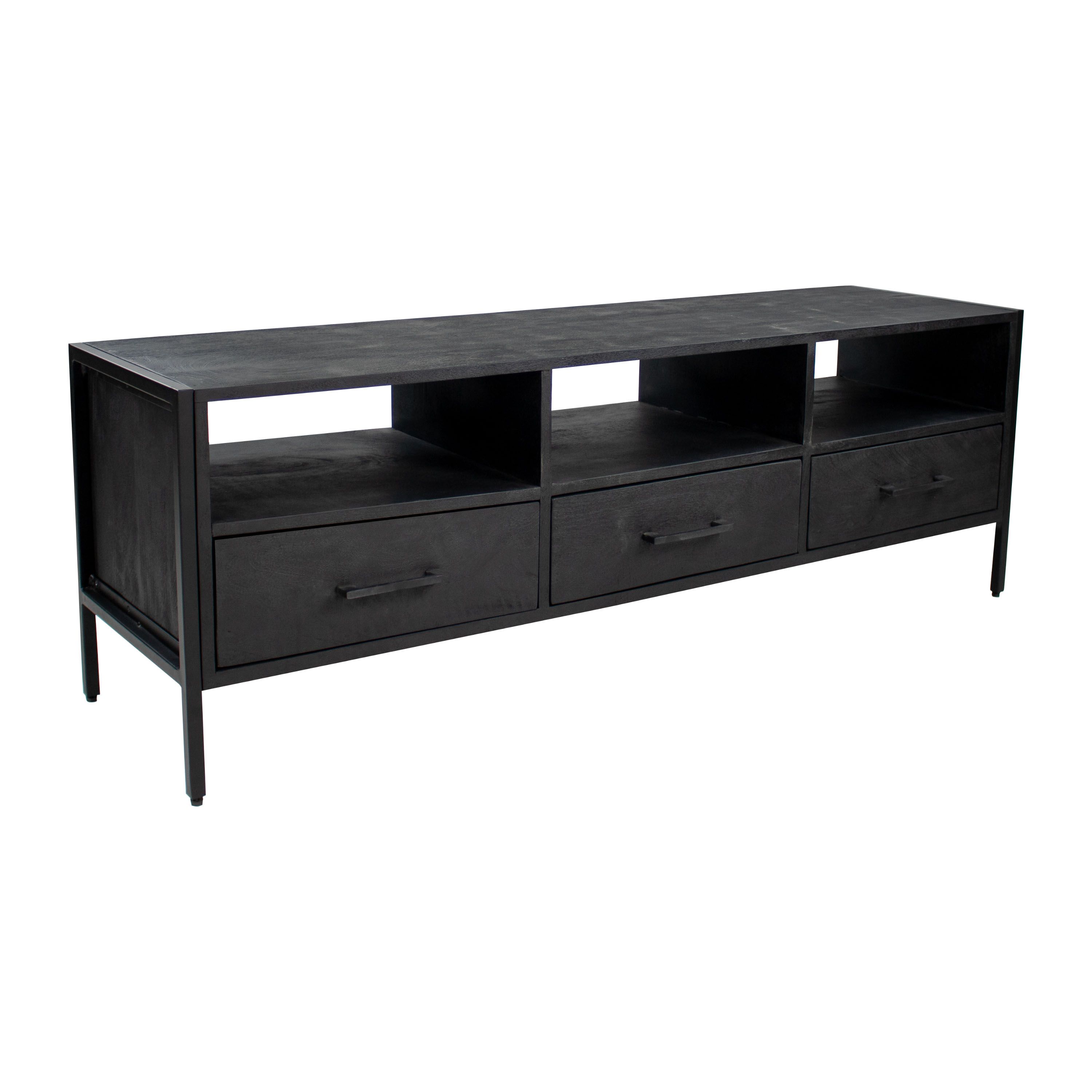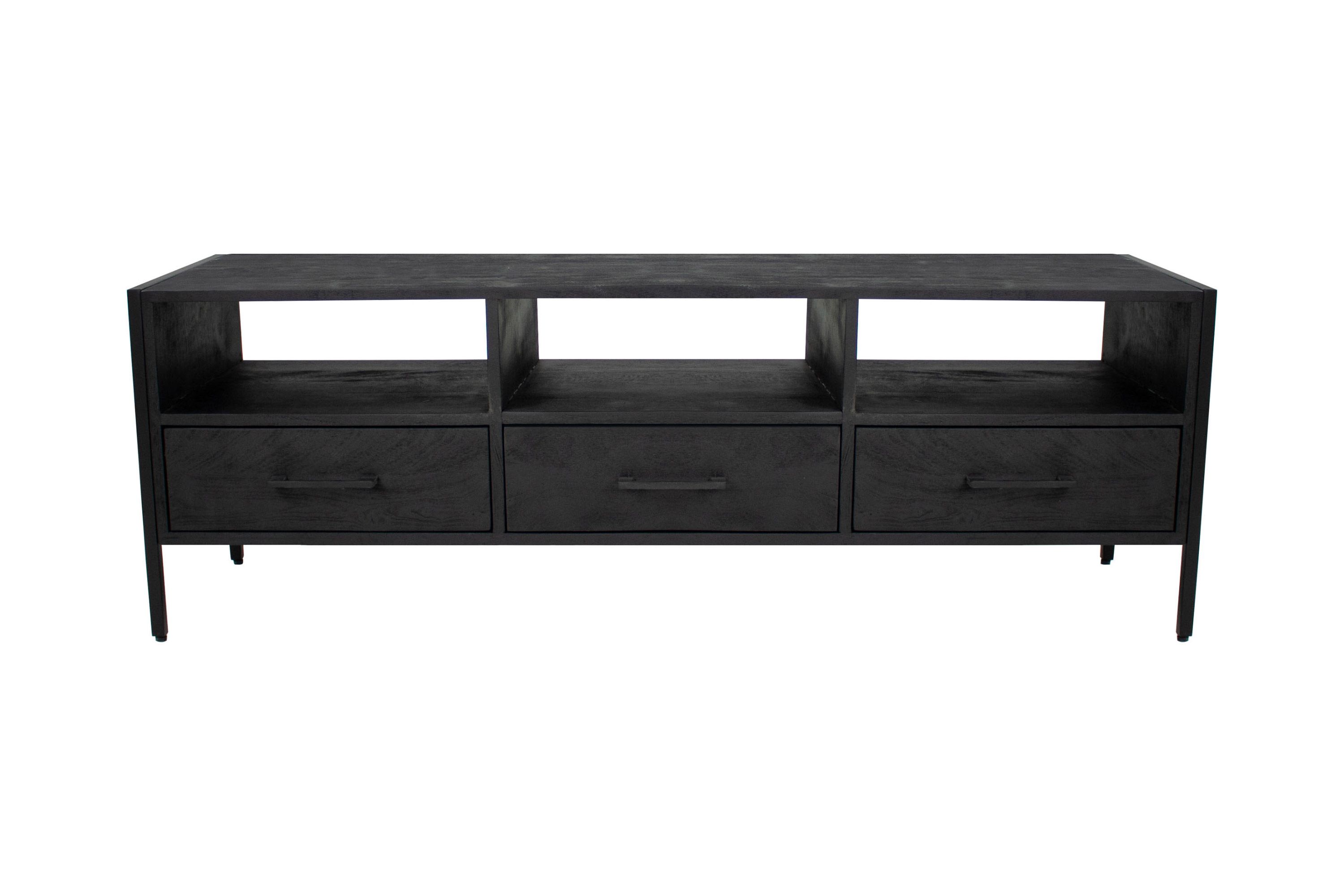 CHECK OUT RAV! Dit stoere TV-meubel komt uit onze RAV serie. Het dressoir is gemaakt van zwart mangohout en wordt gedragen door een slank metalen frame. Het mangohout heeft een matte uitstraling welke zorgt voor een industriële look. Onze RAV TV-meubel is uitgevoerd met 3 lades en 3 open vakken. Dankzij de open vakken werk je de kabels gemakkelijk weg. Bekijk ook de andere producten uit onze RAV serie.