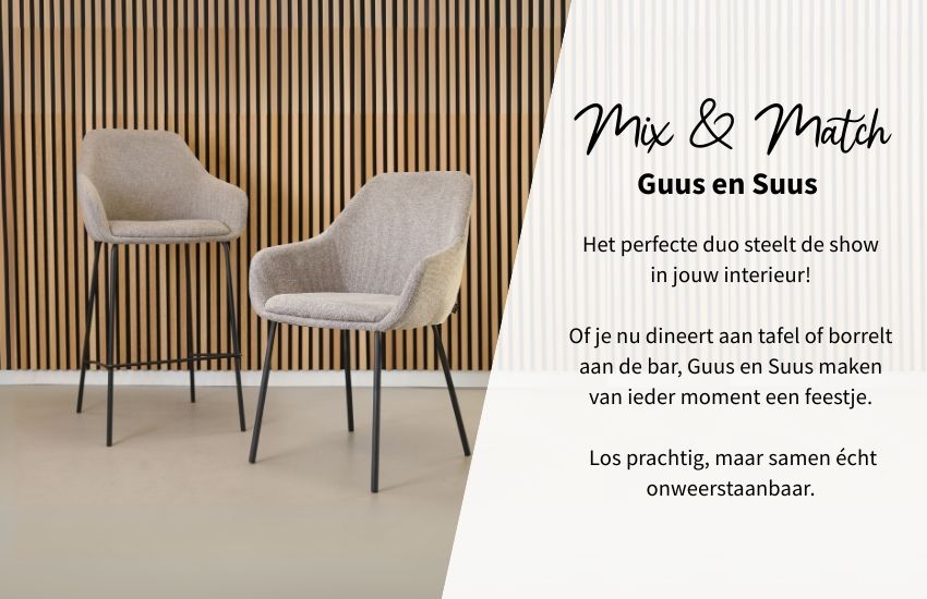 De materiaalkeuze bepaalt zowel de look als het onderhoud. Velvet en bouclé geven warmte en luxe aan je interieur, ideaal als je een rijke sfeer zoekt. Velvet is ook praktisch in onderhoud en geschikt voor intensief gebruik. Katoen en teddy voelen zacht aan en sluiten aan bij een natuurlijke, Scandinavische look. Let bij velvet barkrukken en barstoelen ook op het onderstel. Zwarte metalen poten ogen strak en tijdloos, goud of chroom voegt een chique accent toe. Voetsteunen en glijders verhogen het gebruiksgemak en beschermen je vloer.