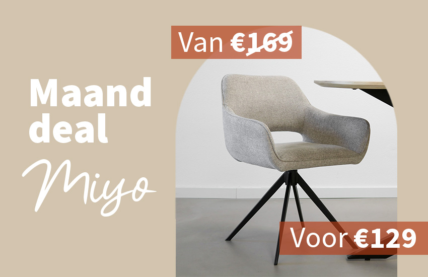 Twee van de meest geliefde modellen uit onze collectie stoffen eetkamerstoelen zijn de draaistoelen Miyo en Tom. Beide modellen combineren een strak design met ultiem zitcomfort. Miyo is gestoffeerd met een hoogwaardige textuurstof en valt op door haar elegante lijnen en subtiele uitstraling. Dankzij het draaimechanisme is Miyo niet alleen stijlvol, maar ook ontzettend functioneel. Tom is een echte blikvanger met zijn velvet bekleding en stoere zwarte metalen onderstel. De horizontale naad in de rugleuning geeft de stoel een extra luxe touch. Beide modellen zijn verkrijgbaar in meerdere kleuren, waardoor ze eenvoudig te combineren zijn met verschillende interieurs. Of je nu kiest voor Miyo of Tom, je haalt gegarandeerd een comfortabele en stijlvolle luxe stoel in huis.